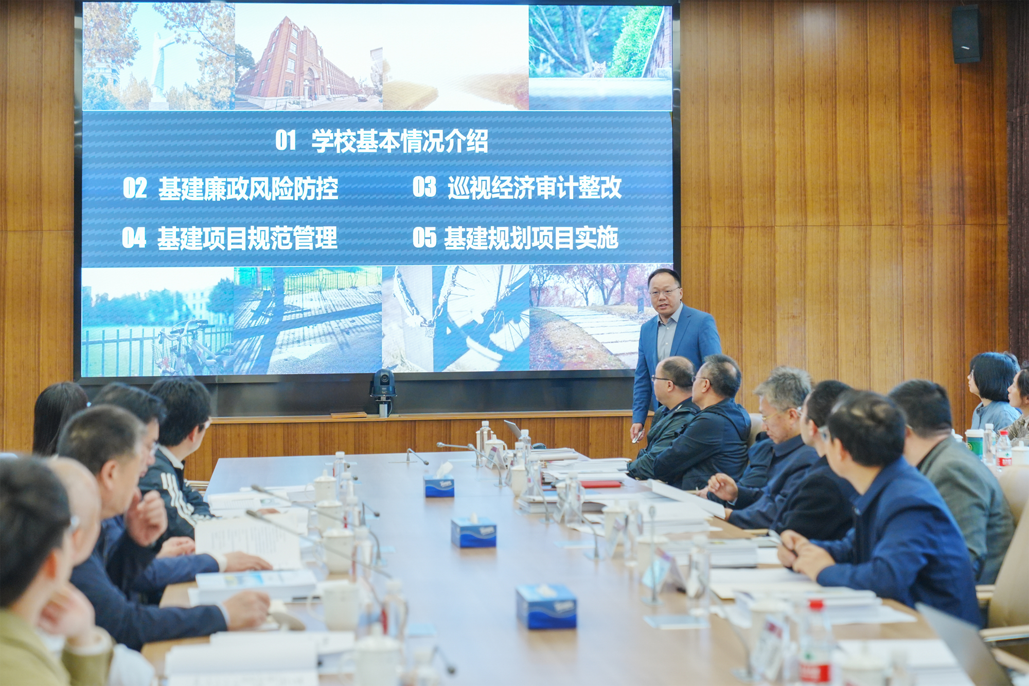芦延华介绍了教育部此次开展调研的目的,并对本次调研提出四点要求:一是提高政治站位,充分认识基本建设工作的重要性。党的十八大以来,党中央、国务院高度重视教育工作,把教育作为国之大计、党之大计,摆在更加突出的优先发展战略地位。校园基本建设工作是推进教育强国高质量发展的基础条件保障,习近平总书记高度重视,多次对校园基本建设工作作出重要批示。我们要深入领会中央领导同志批示指示精神和部领导有关要求,切实把做好校园基本建设工作摆在党和国家教育事业健康发展的高度,主动作为、务实推进、有效落实。二是严格依法建设,切实提升工作的科学性、有效性。校园基本建设工作点多线长面广,任务千头万绪,十分复杂繁重。学校要根据事业发展需要,统筹安排好建设项目实施。要扎实做好项目开工前的各项准备工作,按规定履行审批手续,严禁“未批先建”“边建边批”“边勘察边设计边施工”。项目建设程序看似很细化具体,却有着战略意义和导向作用,校园基本建设工作必须从细节着手,需要时刻记在心里、扛在肩上、抓在手里,切实提升工作的科学性、规范性和有效性。三是强化责任担当,狠抓工作落实的紧迫性、实效性。校园基本建设工作要强化共担意识,学校主要负责同志要亲自研究、亲自部署、亲自参与,压实责任,带头落实好工作任务。学校各级领导和广大干部职工都要树立守土有责、守土负责、守土尽责的理念,主动关心、主动参与校园基本建设工作。基本建设工作战线的同志要主动担当、履职尽责、管好阵地,进一步完善工作机制,提升基本建设管理治理能力,以最高标准、最严要求和最周密举措,推进基本建设治理体系和治理能力现代化。四是高度重视落实,切实贯彻教育部基建调研精神。深刻理解教育部直属高校基本建设管理实地调研通知的精神内涵,以此次实地调研为契机,不断强化高校基建领域廉政风险防控体系建设,不断推动教育部巡视及经济责任审计发现问题的持续整改,不断提升基建项目规范化管理水平,不断稳步推动“十四五”基建规划项目的落地。通过不懈努力,全面推动高校基建工作的制度完善化、程序合规化、决策科学化,使高校基建工作真正成为“双一流”建设的重要支撑和强力保障。