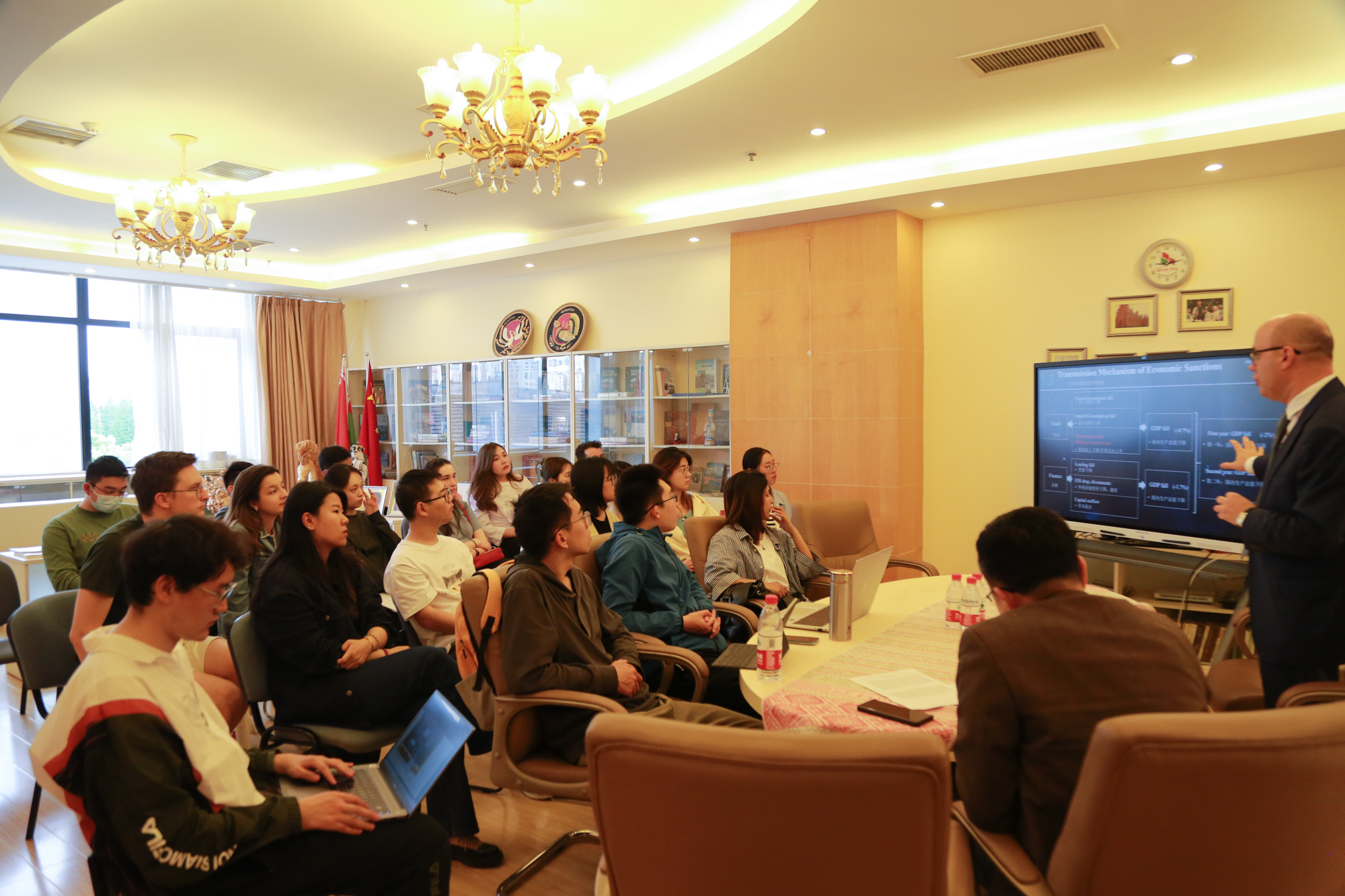鲁德参观了政治与国际关系学院,并围绕急剧变化形势下的制裁、“脱钩”与数字化等议题作了讲座。鲁德从“脱钩”的概念入手,说明了“脱钩”的几种类型,由此溯源至经济制裁的目的、手段及传导机制,以“俄白银行”为案例解释了政府层面、商业层面的脱钩策略,并以中白巨石工业园为例对“脱钩”期间短期发展战略进行了阐述。鲁德详细介绍了中白巨石工业园在面对“脱钩”时所出台的多种应对方案,解释了实施应对方案后的结果。随后,鲁德以西方数字加密为例解析了东欧的数字化与西方“脱钩”之间的关联,并阐释了自己对中国数字货币进入白俄罗斯市场的看法。最后,他通过俄罗斯两个加密平台的案例,总结了对东欧数字化发展趋势的态度:即各个国家会努力发展本国数字化货币,实现本国数字化独立。