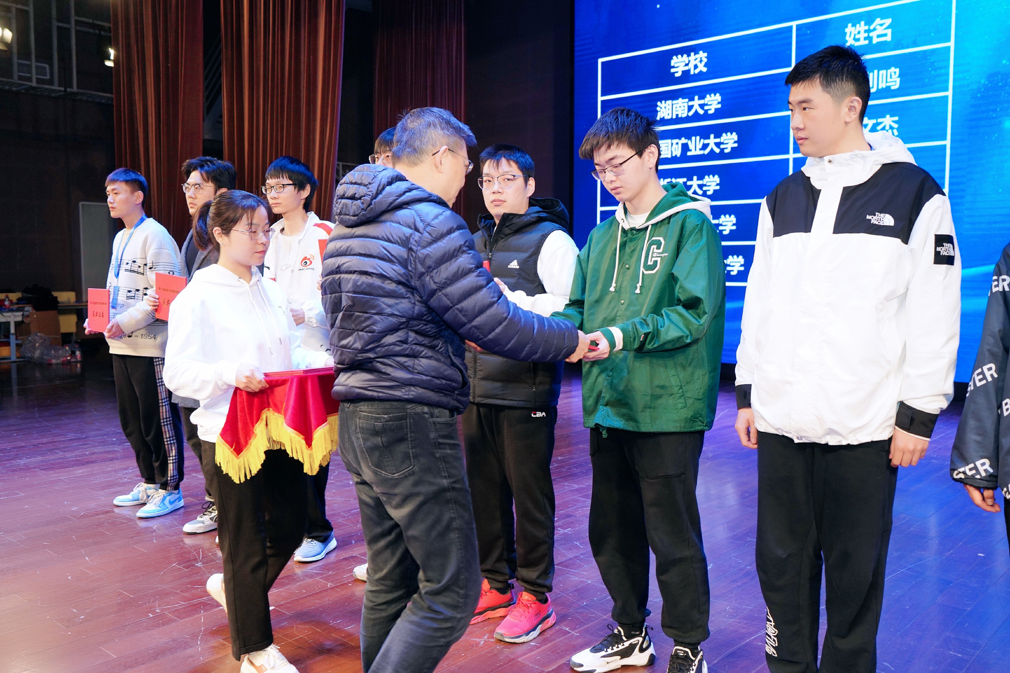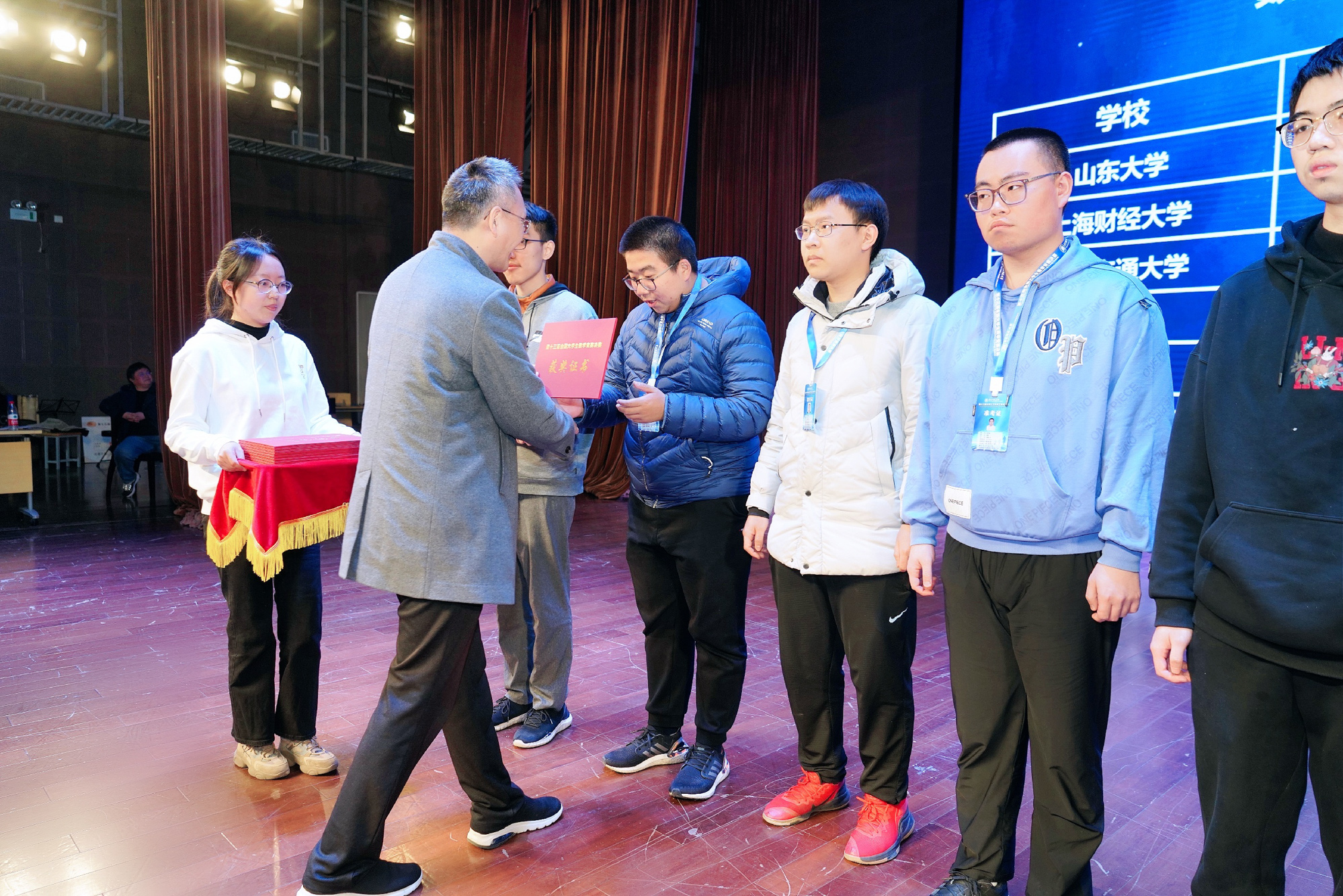 数学高年级组一等奖获得者之一、数学科学学院刘毅炜同学(右一)在颁奖仪式上