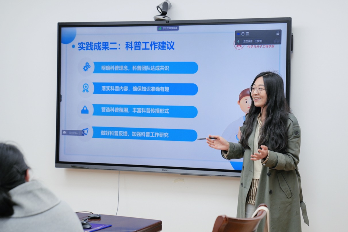随后,“有点文化”团队指导教师王梦雅为同学们带来化学科普小课堂。她从实践背景、实践过程和实践成果三部分向参会师生介绍了主题为“探索化学元素,剖析汉字构造”的科普文化课,展示了“每日一字”图文单页和“每周一课”微视频,并结合实践经验对科普工作开展和科学课程建设路径提出了建议。