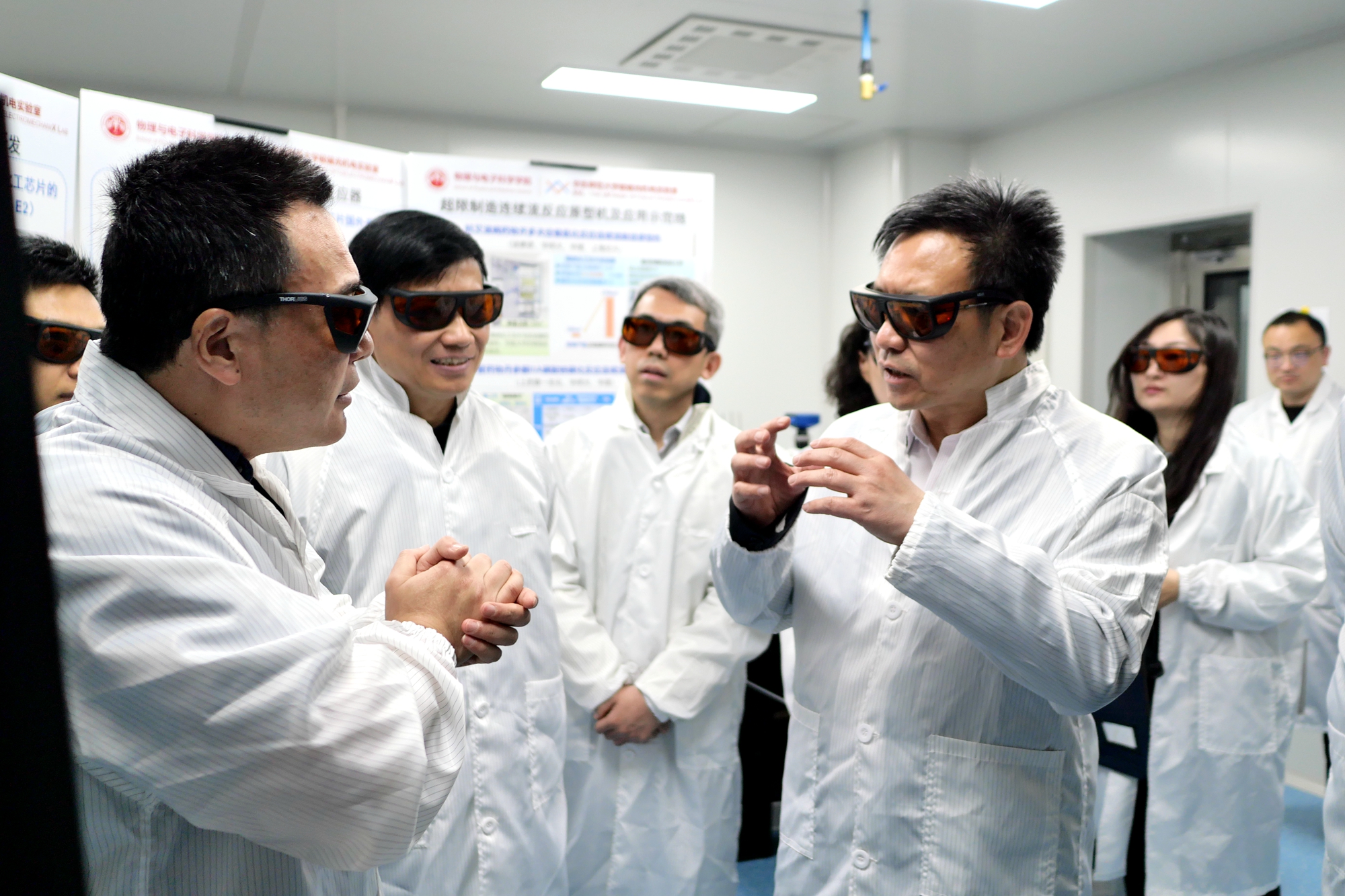 物理与电子科学学院院长、精密光谱科学与技术国家重点实验室主任程亚教授陪同参观了超限制造研发平台与超高速光子芯片光刻技术中心,重点介绍了自主研制成功的高通量微化工芯片、可调谐片上激光器、低功耗人工智能光子芯片和高速调制器等前沿技术原型产品,以及在产业界的应用情况。