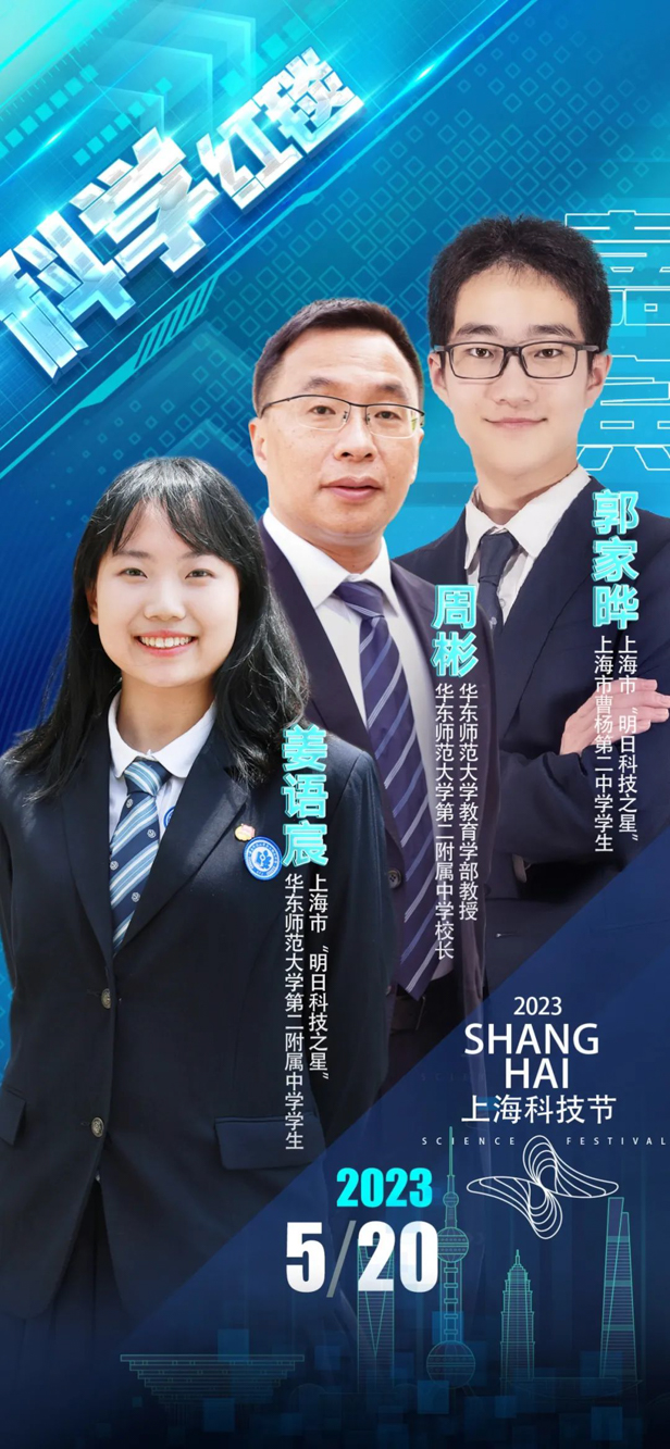 姜语宸与中国科学院院士、中科院上海药物所研究员陈凯先、曹杨二中学生郭家晔共同启动2023上海科技节