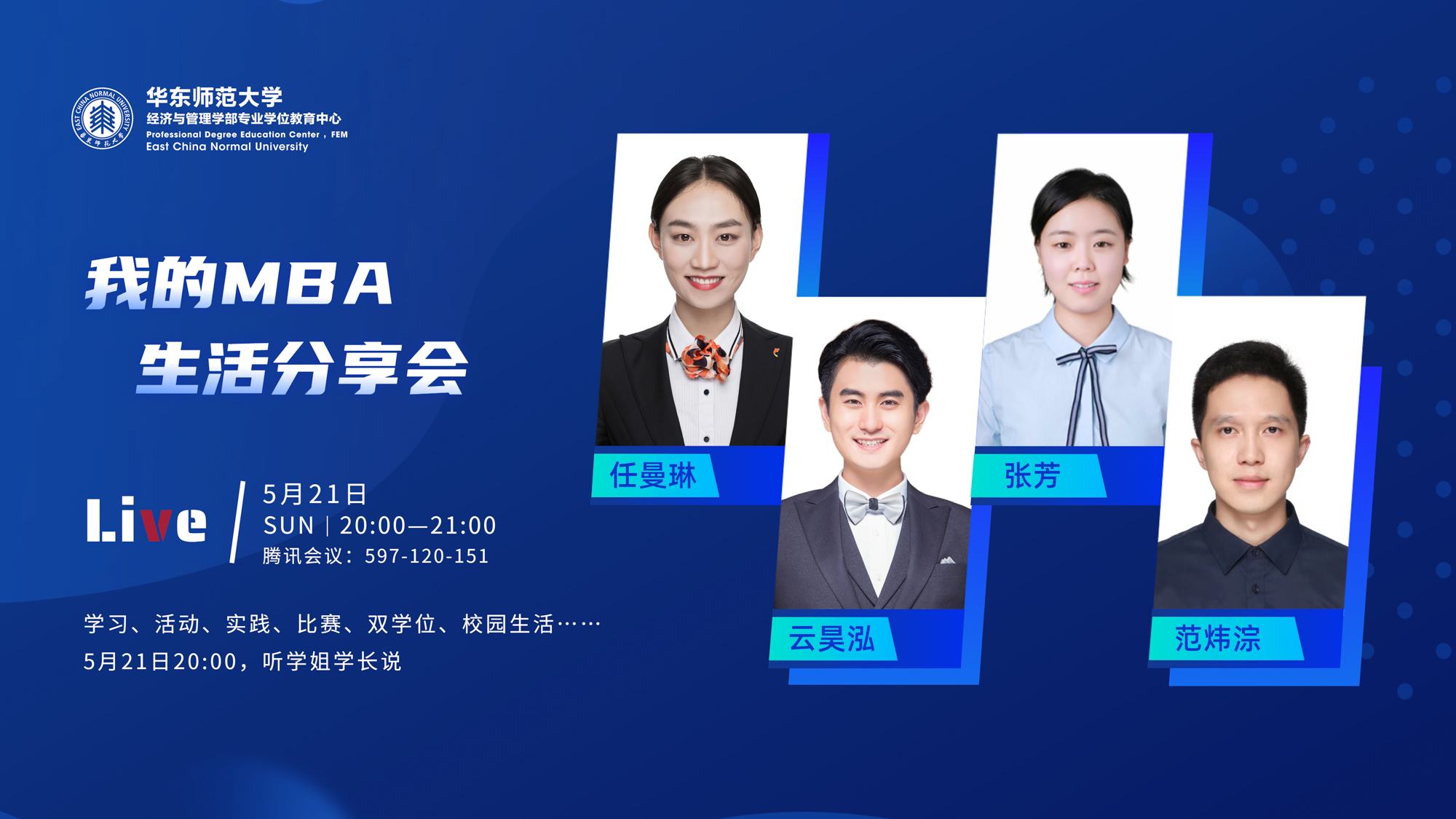 当天晚上,“我的MBA生活”分享会如约上线。浙江泰隆商业银行上海分行客户经理、2019届MBA校友任曼琳,完美网页版与日本横滨国立大学双学位硕士、日本横滨大学在读博士2020届校友张芳,上海音乐出版社舞蹈编辑中心主任、大夏跑团俱乐部部长、2104班班长云昊泓,以及现任MBA联合会主席范炜淙四位优秀校友齐聚云端,与2023级新生们分享了自己的校园生活与工作经历。