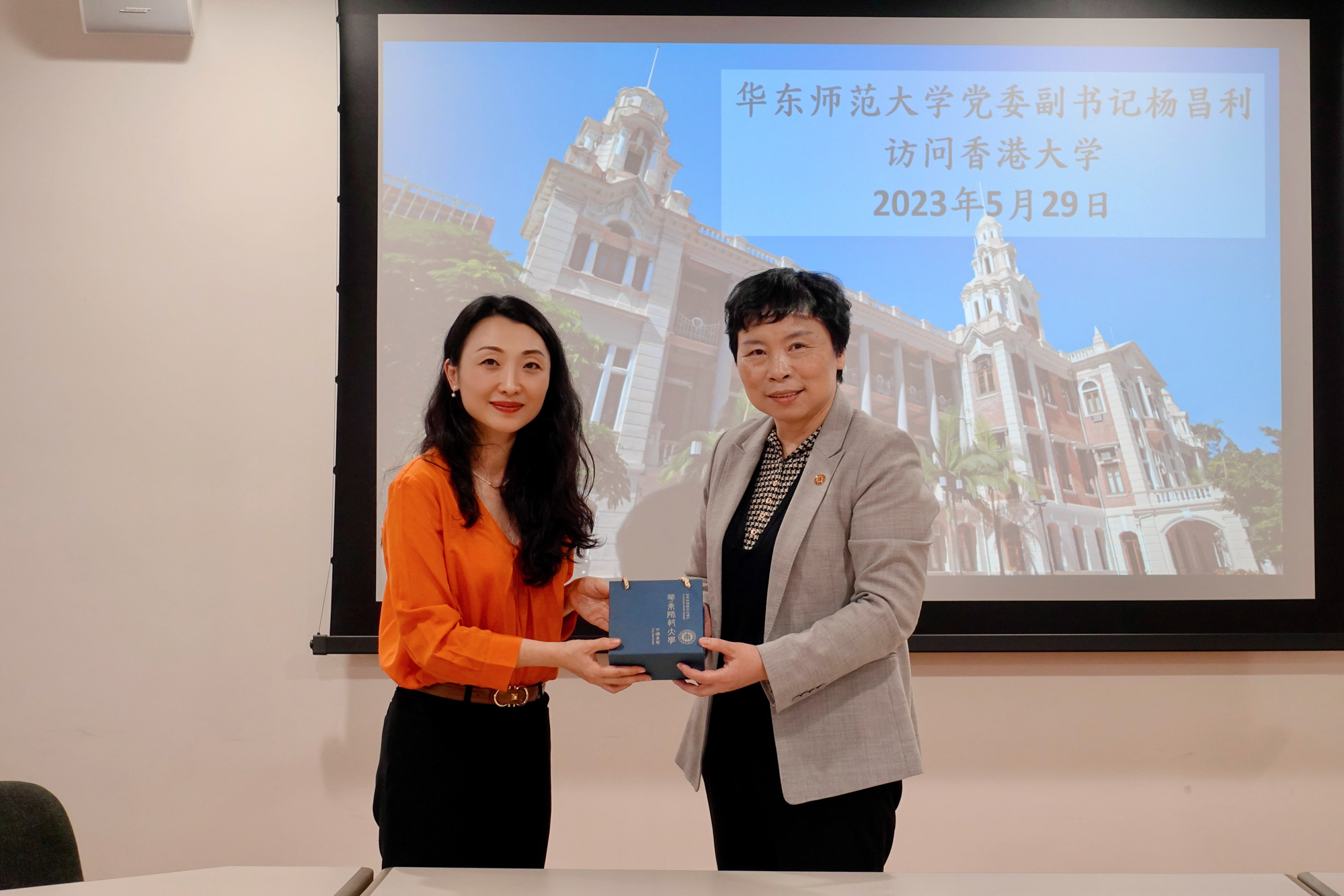 杨昌利向香港大学学术联络部代表致赠纪念品