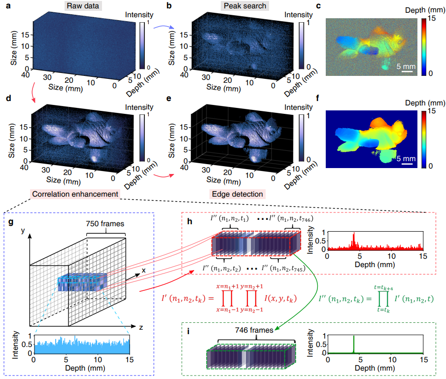 在稀疏光子场景中,有效信号往往被淹没在严重的背景噪声中,仅从强度信息通常难以识别被测目标。为此,如何有效地区分信号和噪声光成为单光子成像的关键难点。为模拟极低照度、高噪声场景,该研究团队将红外信号衰减至0.05光子/像素/秒,对应的信噪比低至1:20000。如图5a-c所示,传统强度峰值识别算法并不能有效甄别信号。在主动成像中,成像系统接收的信号光子在时-空域上具有一定的连续性,而背景噪声光子则会随机分布在整个时间轴与空间像素点上。基于该特性,研究人员发展了精确、高效和鲁棒的点云去噪算法,通过关联增强空间相邻像素与相邻时间帧的强度,有效提取与甄别信号光子,进而实现高背景噪声下的中红外单光子三维成像(图5d-i)。