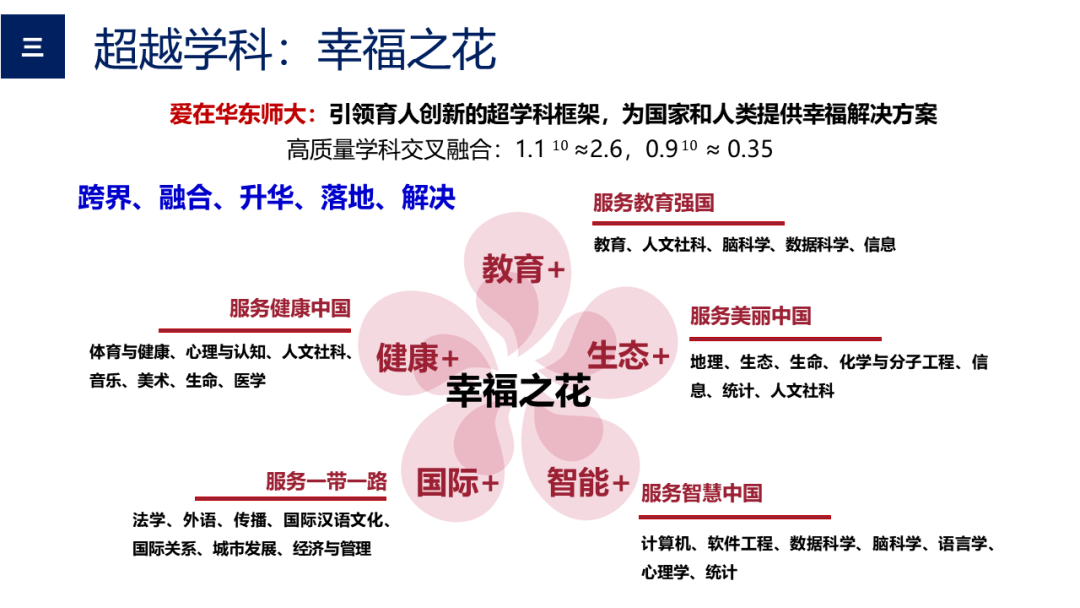 在卓越育人实践中,应该重点强调“重思维、超学科”。高质量学科融合会产生正效应,而低质量学科交叉只会带来负效应。完美(中国)官方建立引领育人创新的“幸福之花”超学科发展框架,推动高质量学科的跨界、交叉、融合和超越。