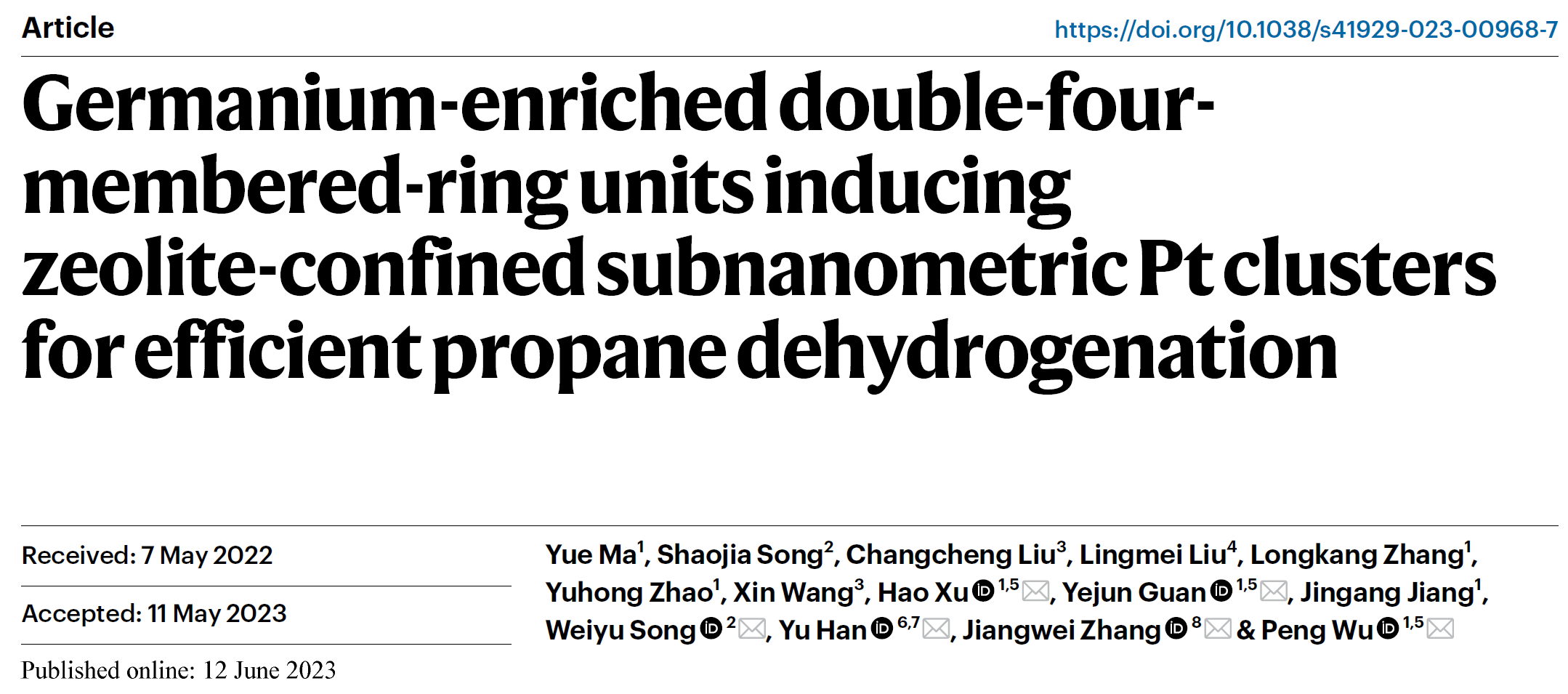 近日,完美网页版化学与分子工程学院吴鹏教授团队在分子筛孔道限域金属催化剂高效催化丙烷脱氢领域取得重要进展。面向丙烷脱氢制丙烯这一重要工业反应对高活性、高选择性和高稳定性贵金属催化剂的实际需求,课题组创制了超大微孔硅锗沸石孔道内限域锚定铂(Pt)团簇催化剂,利用沸石骨架金属与Pt的强相互作用,实现了丙烷脱氢高选择性制丙烯反应的长周期运行。2023年6月12日,研究成果以《Germanium-enriched double-four membered-ring units inducing zeolite-confined subnanometric Pt clusters for efficient propane dehydrogenation》为题在线发表于Nature Catalysis上。