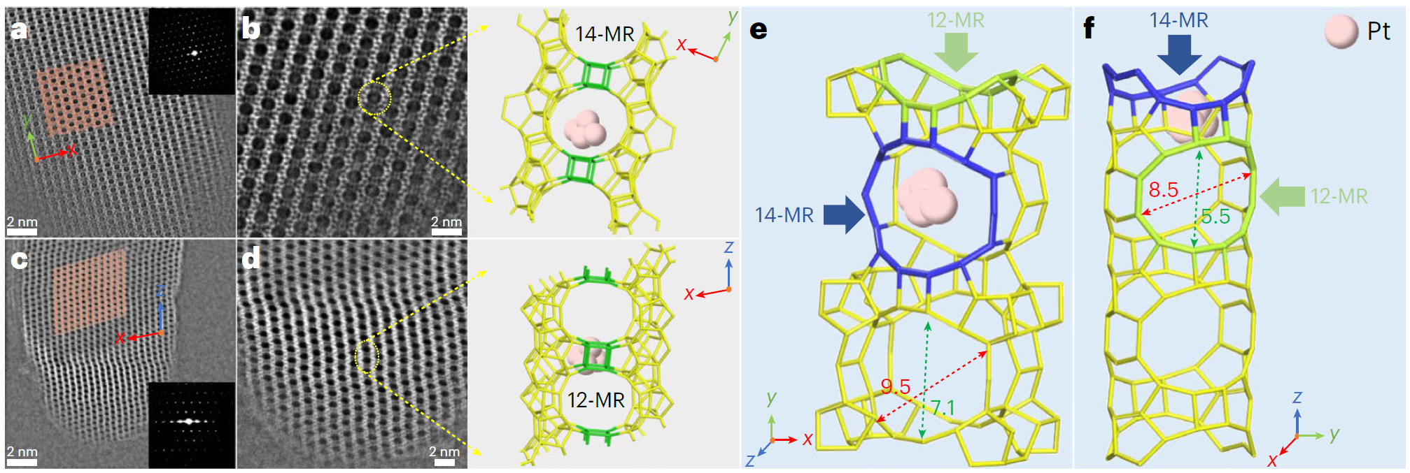 课题组利用积分差分相位衬度成像扫描透射电子显微镜,证实了亚纳米级的Pt团簇特异性地落位在UTL的14元环孔道内,表明Pt在UTL孔道中占据了特定位置,这与14元环孔道具有较大孔尺寸以及骨架Ge在双四元环结构单元的局部富集有关。