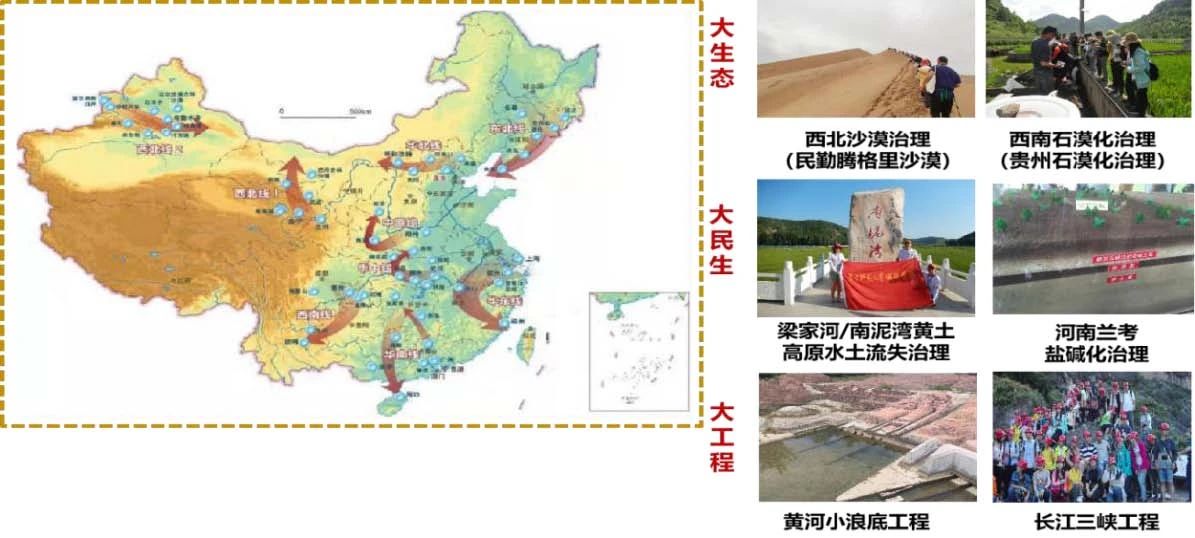 通过14年的努力,已形成全国近200个实习站位,形成1500多个课程思政牵引的野外实习教学设计,基本覆盖西北沙漠治理、黄土高原水土流失治理、长江三峡等一系列国家重大需求/工程,有效拓展了学生的学科视野和思维。