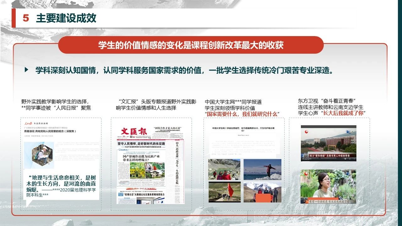 课程团队还打破校际壁垒,牵头全国5个地理学拔尖 2.0 基地,7个国家理科人才培养基地和 40 所地理学国家一流本科专业建设点院校,构建全国地理学联合实践教学体系,构建覆盖全国的实习资源网。