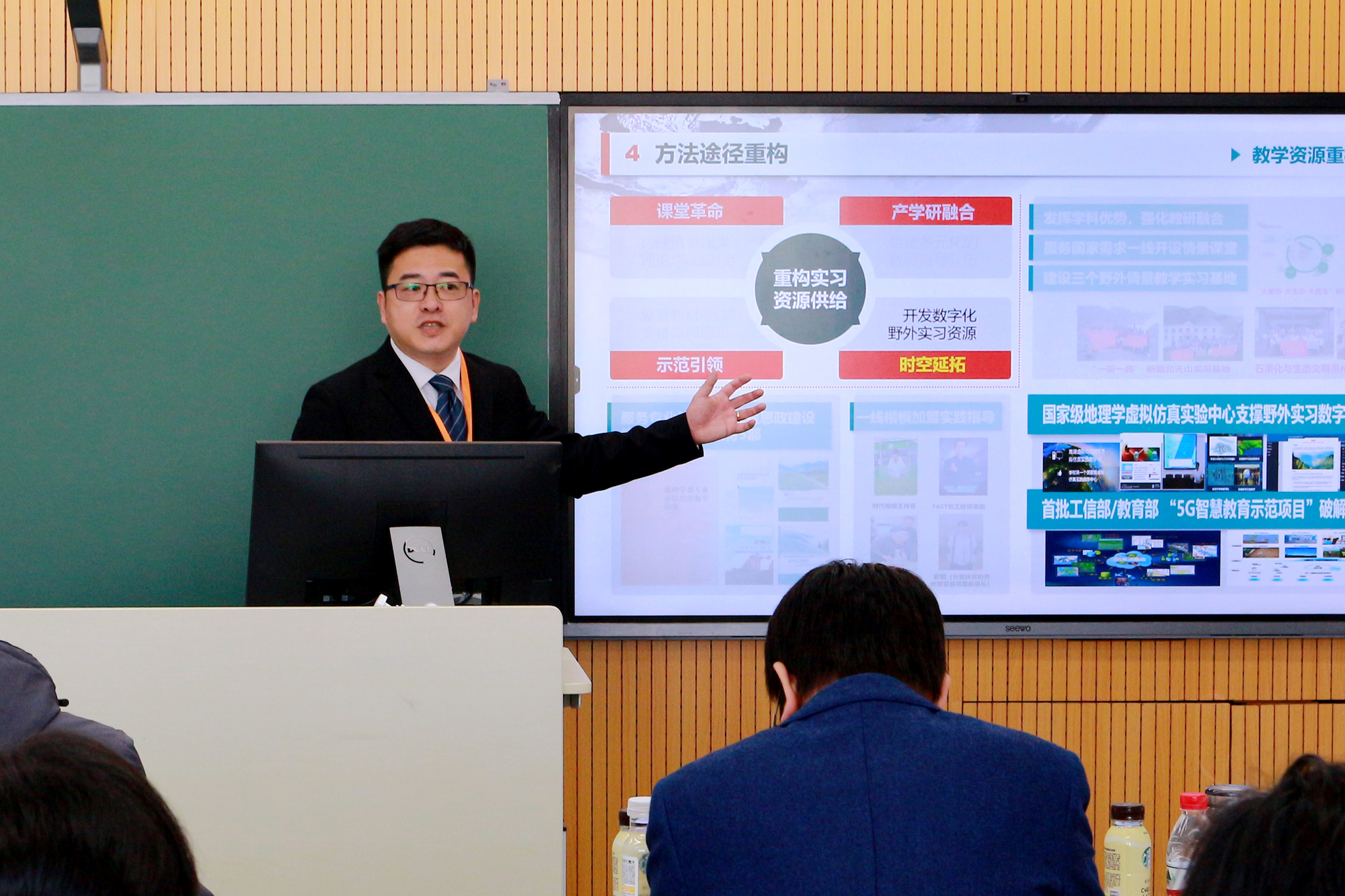 周立旻以“大生态”主题中的“石漠化治理”为例作了介绍,“我们构建‘石漠化治理与脱贫攻坚’主题实习,面向被称为“地球癌症”、受党和国家高度重视的西南喀斯特石漠化问题,与中国科学院地球化学研究所合作,共建贵州普定课程思政野外实践基地,实现专业知识综合与国家重大生态问题的贯通;同时,立足我国西南地区喀斯特石漠化空间格局演化历史分析,实现普适性自然地理过程与我国喀斯特特殊性国情认知的贯通;解构路沟池一体化治理技术,分析破解重度石漠化的学科思维,分享助力脱贫攻坚的喜悦,实现基础研究与应用服务范式的贯通;在教学设计中不回避治理历程中走过的弯路,将失败的案例转化为认识喀斯特坡地水循环典型的教学范例,实现科学精神与知识技能学习的贯通。”