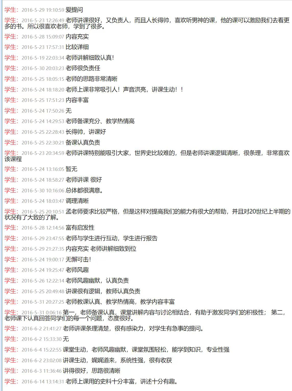 《20世纪世界史》是历史学系乃至全校最受欢迎的专业必修课之一,连续开设近三十年,学生评教成绩始终在4.8以上(满分5分),累计听课学生逾2000人。