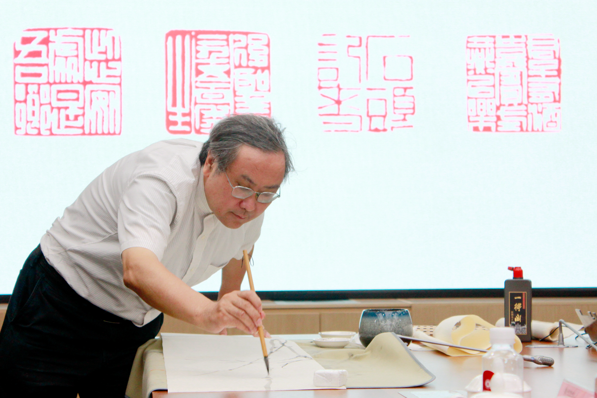 张索以《从梅兰竹菊四君子谈起》为题,基于中华传统廉洁文化、艺术审美的角度,从中国古代的君子人格出发,结合中国传统书画作品,深入分析了梅兰竹菊的象征意义,并通过现场作画教学进行了阐释说明。