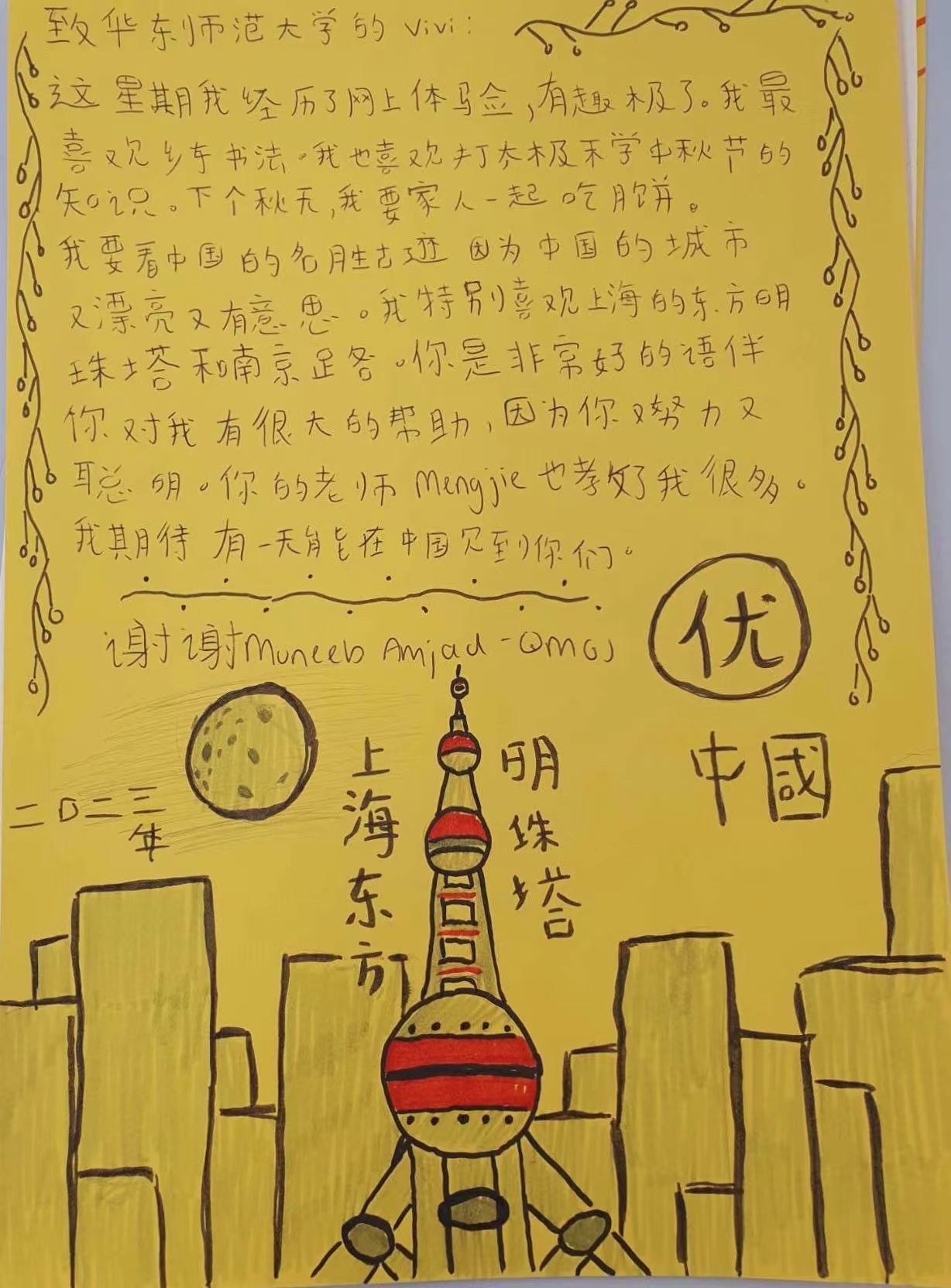 来自Queen Mary’s Grammar School的Amjad在致完美(中国)官方的一封信中写道:“我最喜欢练书法,我也喜欢打太极拳和学习中秋节的知识。下个秋天,我要和家人一起吃月饼。我特别喜欢上海的东方明珠塔和南京路,期待有一天能在中国见到你们。”