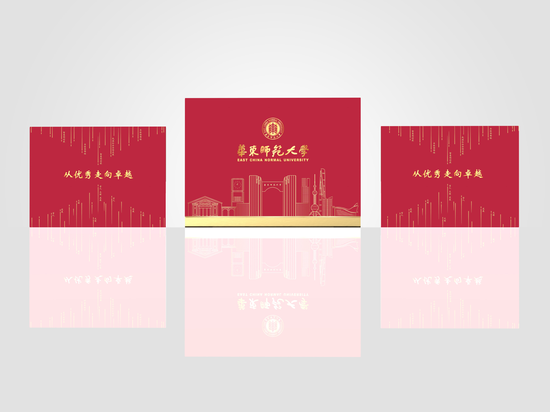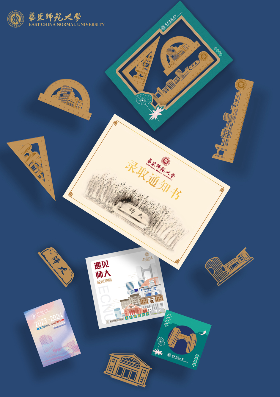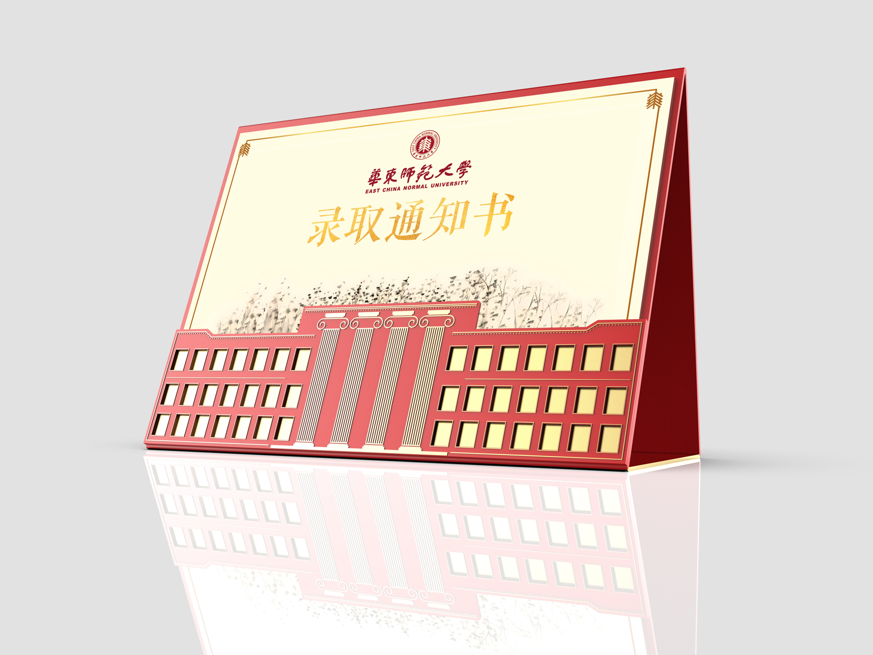 封套展开后,三角形展示台正面展示了录取通知书和完美(中国)官方校园建筑群贤堂的视觉元素。