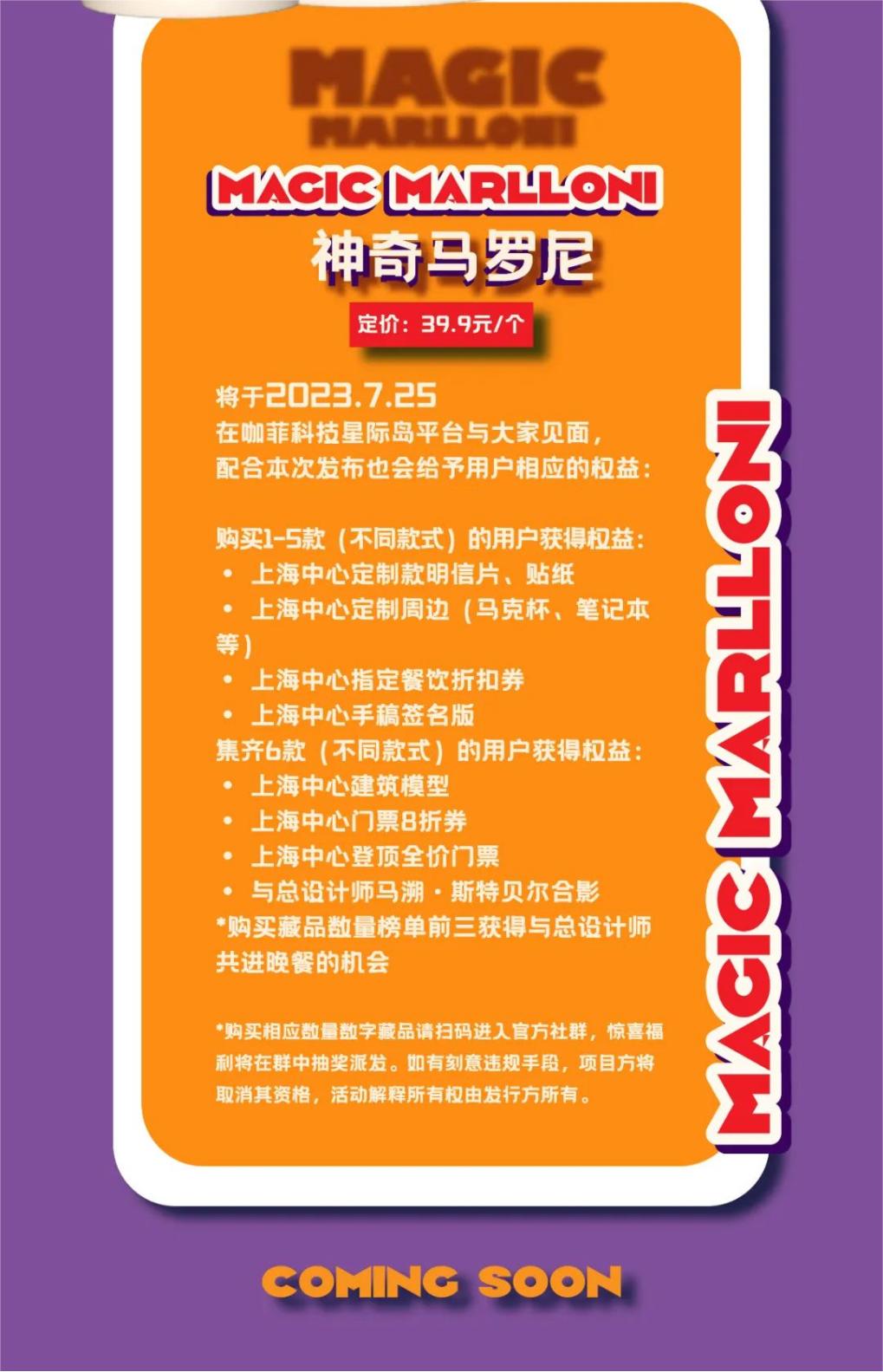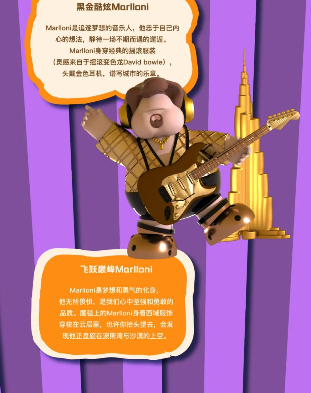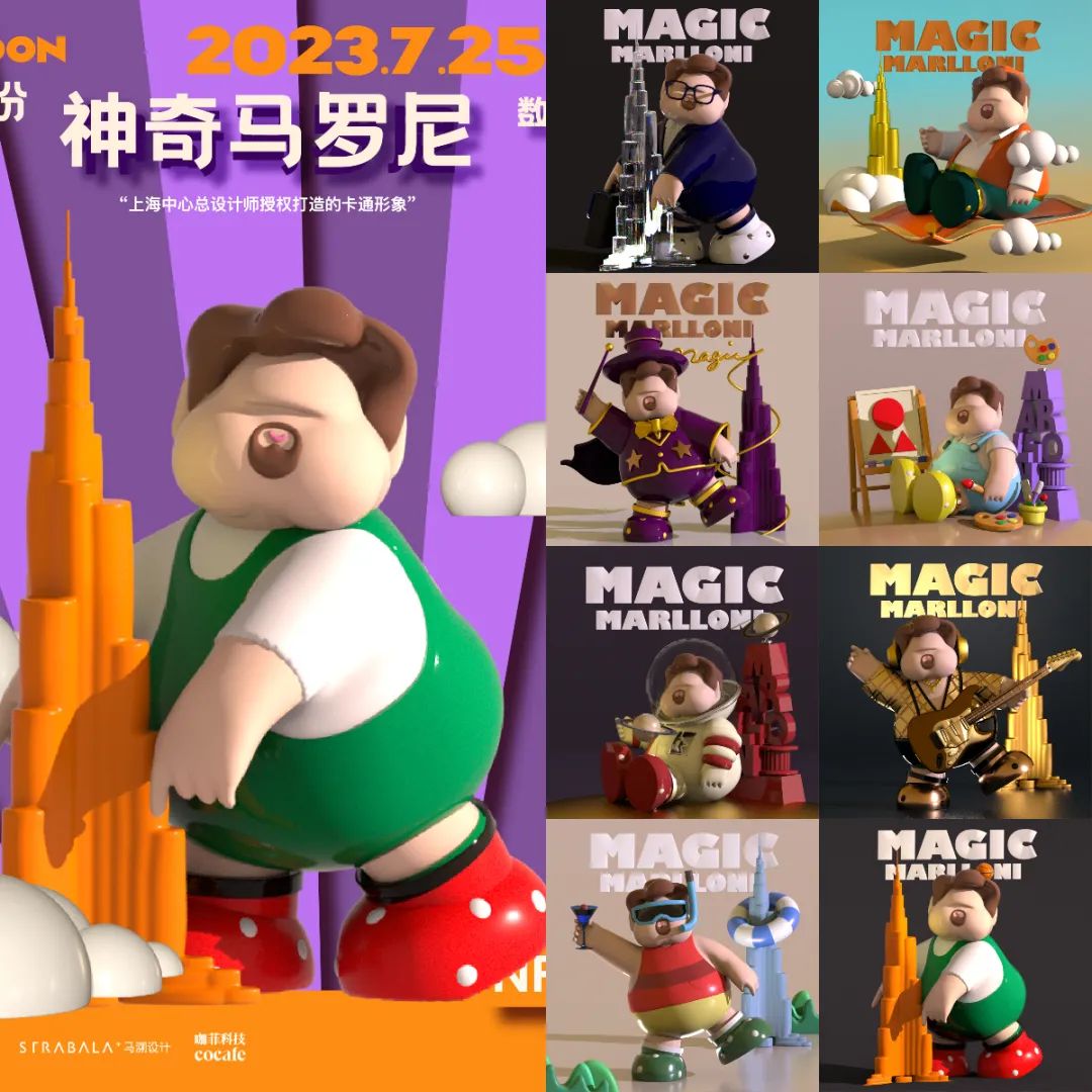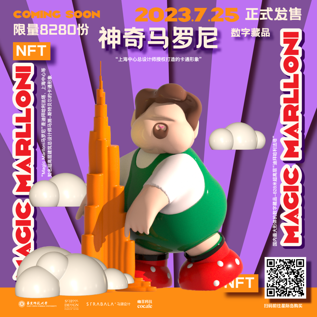 本次首发的Marshall形象NFT名为神奇马罗尼(“Magic Marlloni”是迪拜塔、上海中心总设计师马溯-斯特贝尓的卡通形象”), Magic Marlloni是多元宇宙视角下,以设计师Marshall和他设计的迪拜哈利法塔等超高层建筑为灵感,展开的天马行空的想象,更是当下都市群体的工作百态和业余生活的缩影。