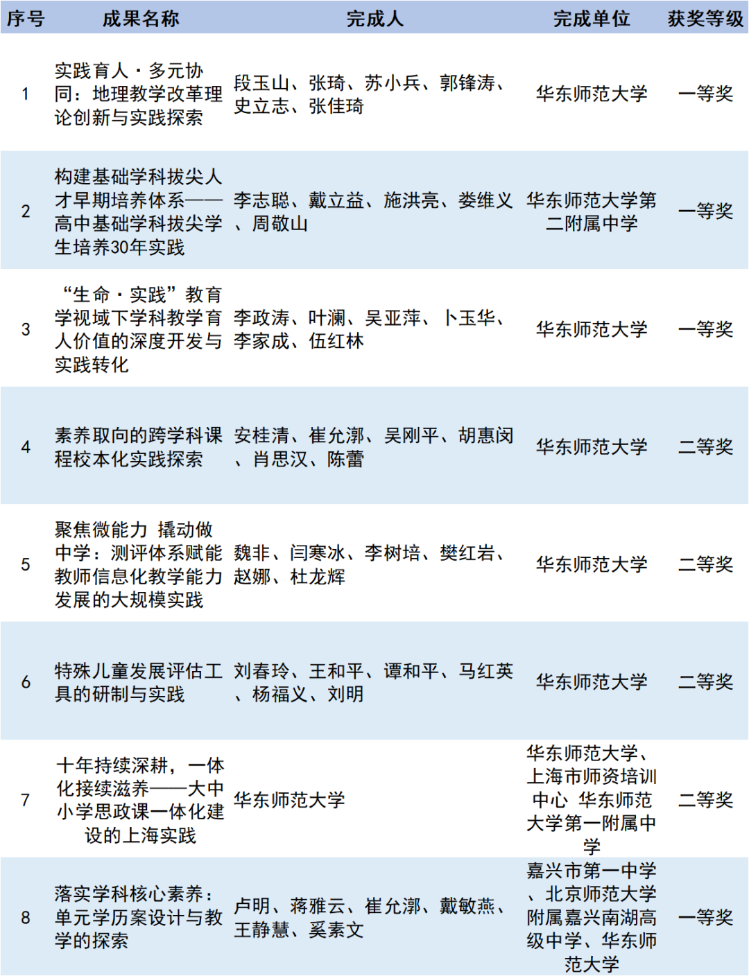 (作为第一完成单位,荣获一等奖3项,二等奖4项,合计7项;作为参与完成单位,荣获一等奖1项;总计8项)