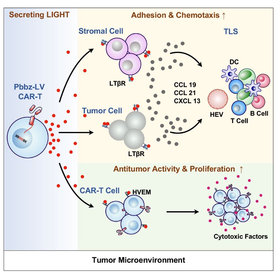 近日,生命科学学院杜冰教授和刘明耀教授团队与合作者在Molecular Therapy杂志上发表相关论文,开发了一种新型共分泌LIGHT的CAR-T细胞,显著提升CAR-T细胞对前列腺癌和黑色素瘤的治疗效果,为实体肿瘤的CAR-T治疗提供了一种新策略。