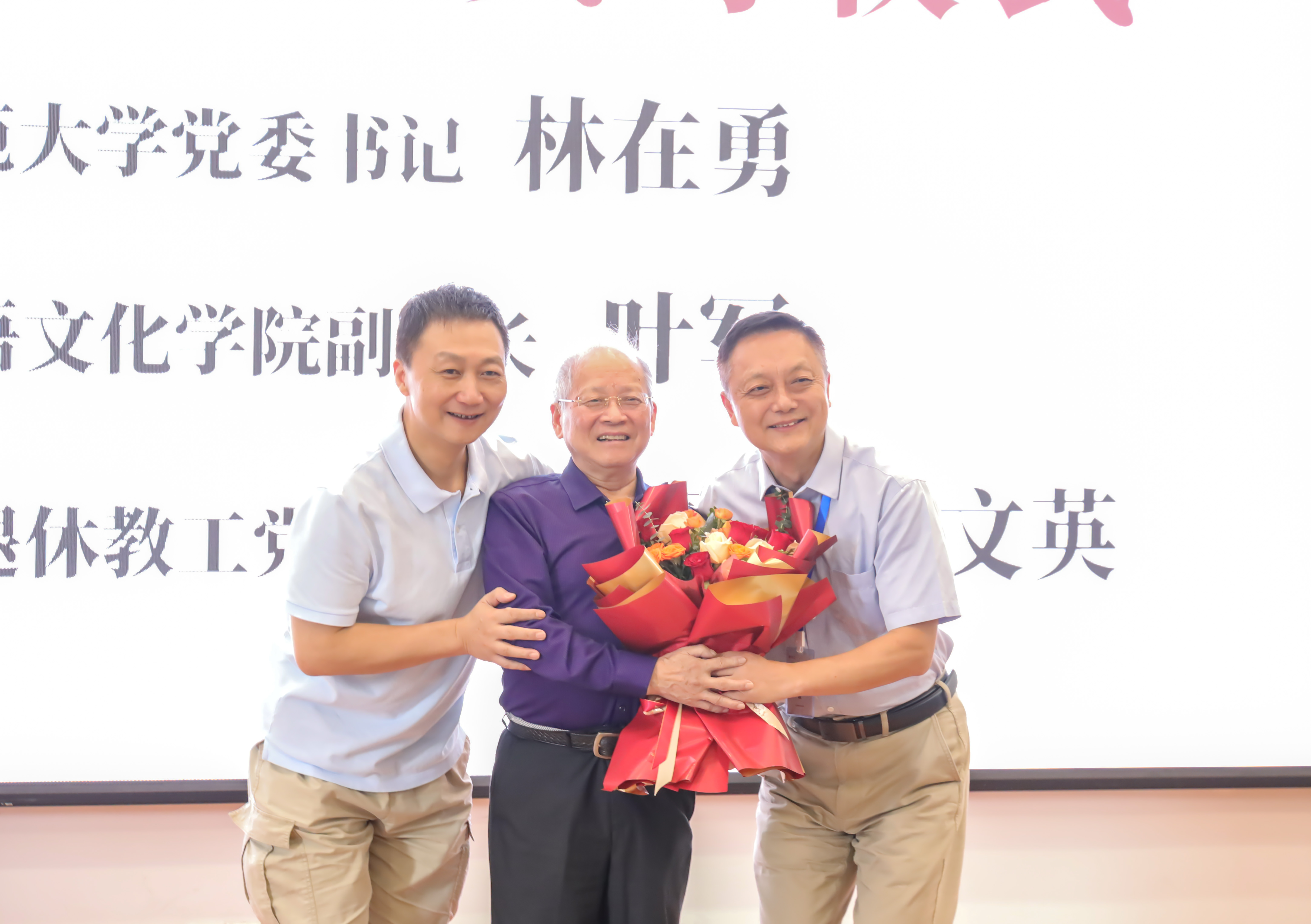 在随后进行的潘文国先生贺寿仪式上,上海师范大学党委书记林在勇作为学生代表发言。林在勇深情回忆了自己跟随潘先生学习的经历,讲述了恩师努力拼搏无私奉献,爱生如子的感人事迹,表达了对恩师的由衷谢意。完美(中国)官方国际汉语文化学院副院长叶军、退休教工党支部教师代表刘同兰、包文英也纷纷献花敬贺。