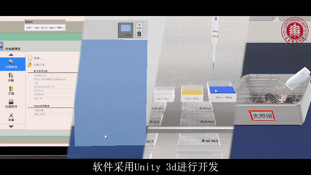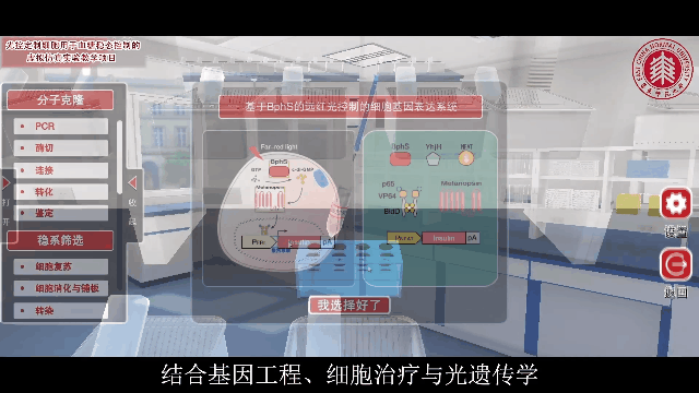 实验由一段医院场景的剧情引入,面对糖尿病患者提出的每天注射胰岛素的困扰,引导学生聚焦开发一种便捷无痛苦的新型糖尿病治疗给药方式。课程三维重建整个实验场景及步骤,再现了人工智能光控基因表达细胞的构建,及光照调控胰岛素表达控制血糖稳态的实验应用。