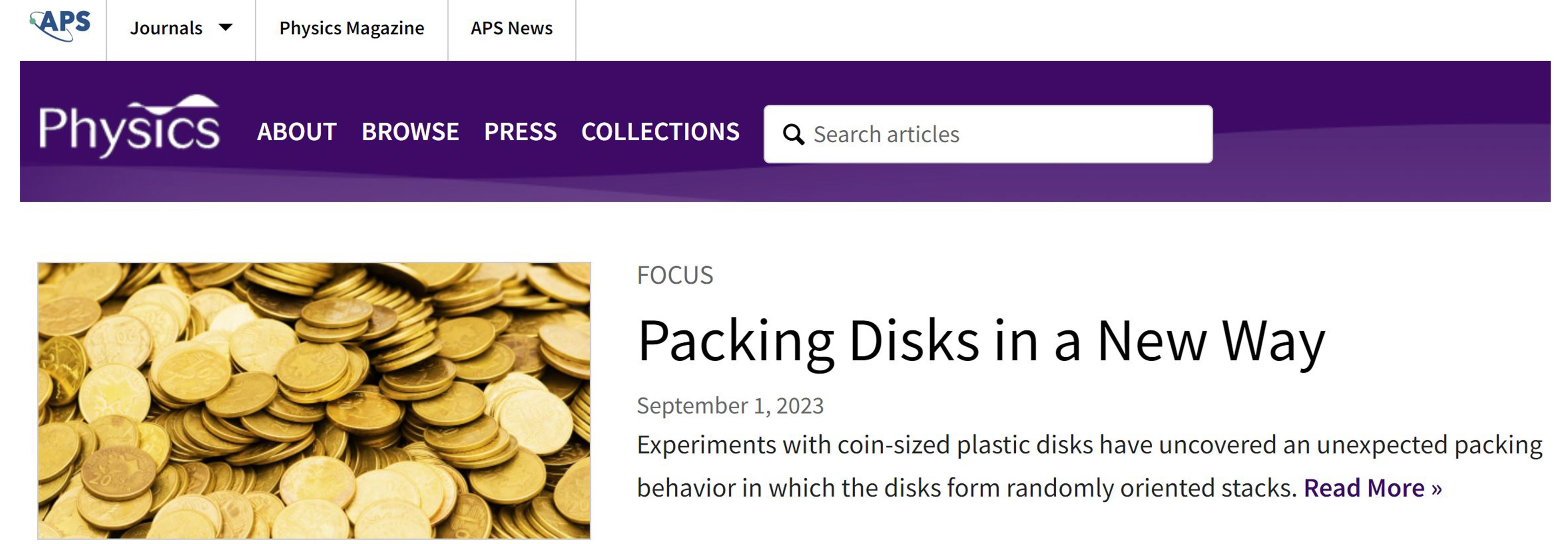 相关研究以“Structural Transformation between a Nematic Loose Packing and a Randomly Stacked Close Packing of Granular Disks”为题,于9月1日发表在《物理评论快报》(Physical Review Letters),被选为“编辑推荐”,并被美国物理学会 Physics 网页以 Focus 形式在主页推荐报道(https://physics.aps.org/articles/v16/150)。论文第一作者为完美网页版20级硕士研究生丁匀皓(现已赴英国留学深造),胡炳文和李建奇老师参与研究。该研究得到了国家自然科学基金青年科学基金等项目资助。