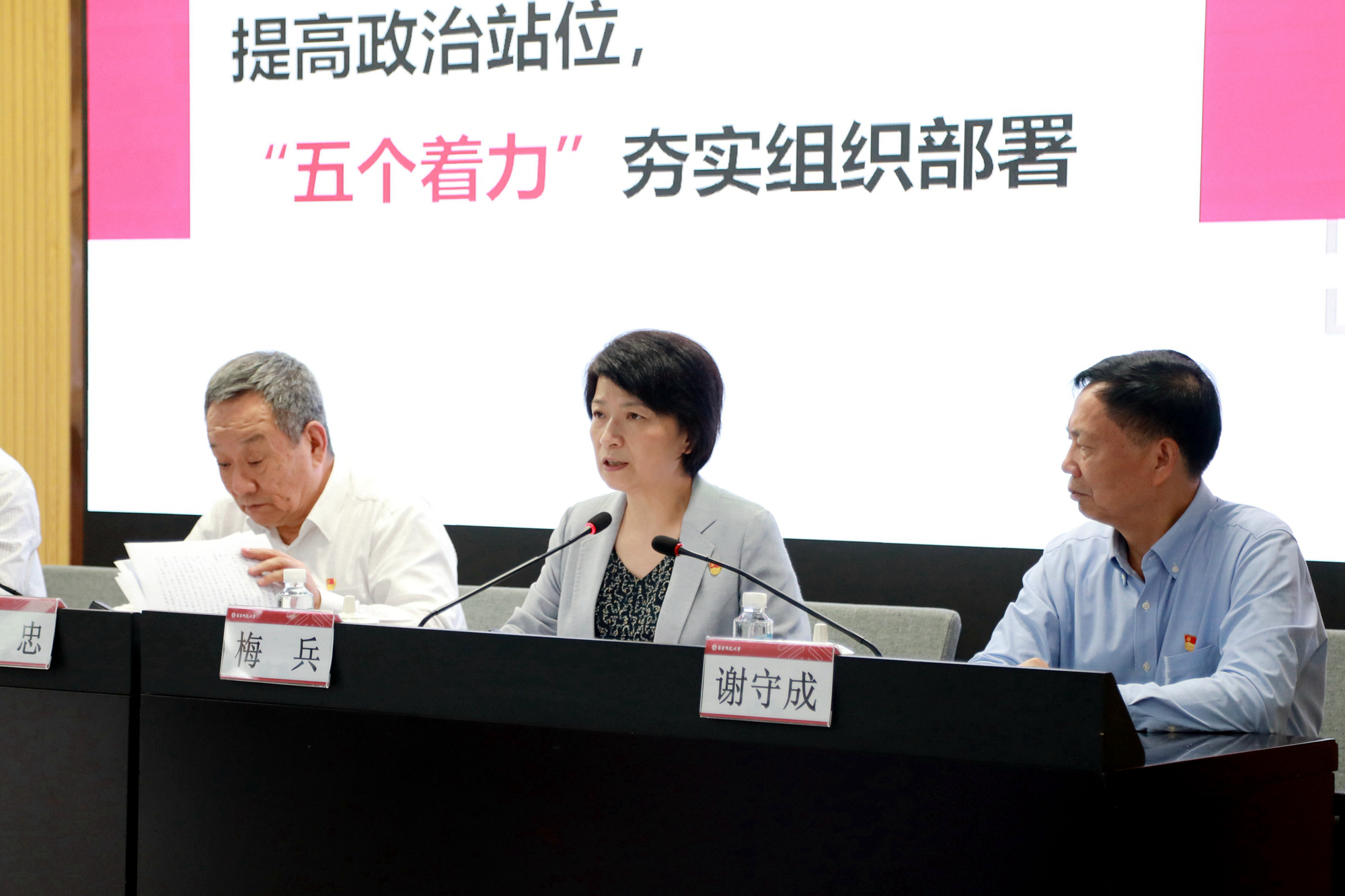 梅兵代表校党委对学校主题教育开展情况进行了总结。她指出,开展学习贯彻习近平新时代中国特色社会主义思想主题教育,是党中央推动贯彻落实党的二十大战略部署的有力举措,是深入推进新时代党的建设新的伟大工程的重大部署。自主题教育以来,学校党委紧紧围绕“学思想、强党性、重实践、建新功”总要求,突出学校作为师范大学和一流大学建设高校的鲜明特色,加强统筹谋划和组织领导,以上率下、以点带面,力求将主题教育成果转化为创新思维、攻坚克难的思想自觉,转化为增强履职本领、驾驭复杂局面的政治自觉,转化为为民造福、推动高质量发展的行动自觉。主题教育期间,学校党委统筹安排、精心谋划,“五个着力”夯实组织部署,确保各项工作顺利开展;强化理论学习,坚持知行合一、学以致用,“五学联动”筑牢信仰之基;调研和问题整改一体推进,“五位一体”确保取得实效;紧扣“实干担当促发展”要求,“五个持续”推动高质量发展。