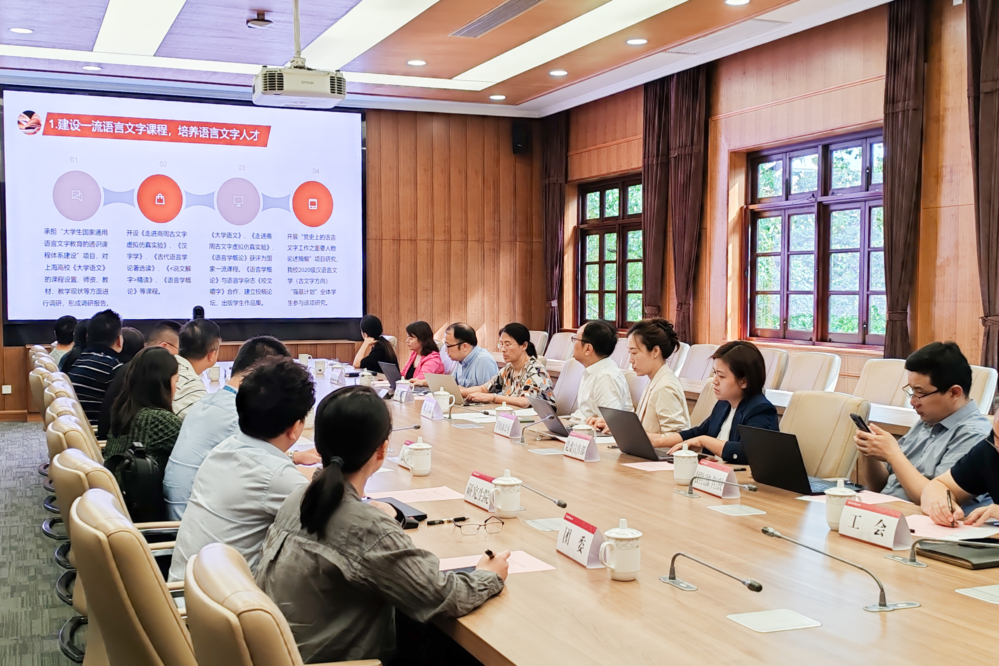 学校国家通用语言文字推广基地副主任、中文系党委书记吕志峰介绍了基地在服务国家战略开展推普助力乡村振兴、服务上海市中小学基础教育分级阅读以及对大学语文课程群建设方面的工作,并提出明年下半年由我校承担上海市高校语言文字工作协同发展联盟轮值主席,届时将联合学校各语言文字工作成员单位开展典耀中华主题读书行动等相关活动。