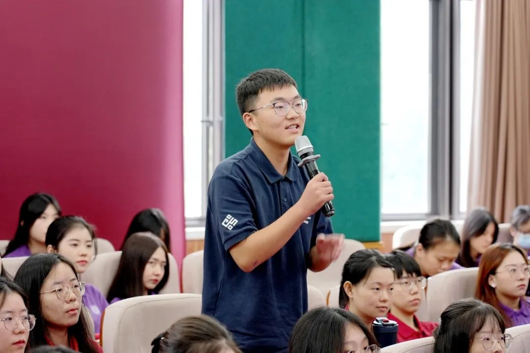 在交流环节,线下会场的同学们踊跃提问,师生展开交流。针对“如何将师范学习融入专业学习”、“如何成为拔尖型科技创新人才”、“如何讲好师大故事”、“怎样在实际行动中践行校训精神”等问题,梅兵为大家答疑解惑,分享自己的观点与建议。