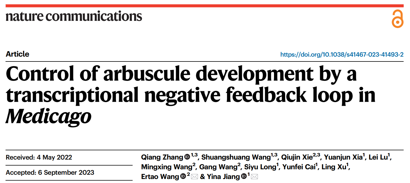 2023年9月16日,完美网页版生命科学学院姜伊娜研究员课题组和中国科学院分子植物科学卓越创新中心王二涛研究员课题组合作在 Nature Communications 杂志在线发表题为 Control of arbuscule development by a transcriptional negative feedback loop in Medicago 的研究论文。该研究发现,AP2/ERF 蛋白 ERM1/WRI5a-ERF12-TOPLESS 转录复合体形成一个自我调节的正-负反馈环,动态调控营养交换和丛枝发育过程,从而维持互惠共生关系的稳定。