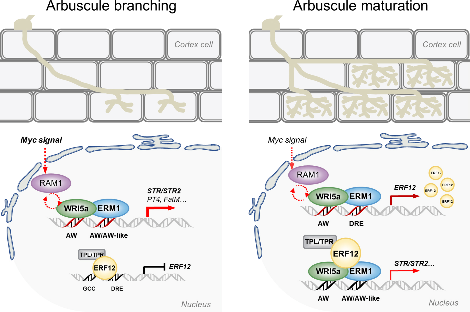 图三. 共生过程中 ERM1/WRI5a–ERF12–TOPLESS 复合体动态调控营养转运模型