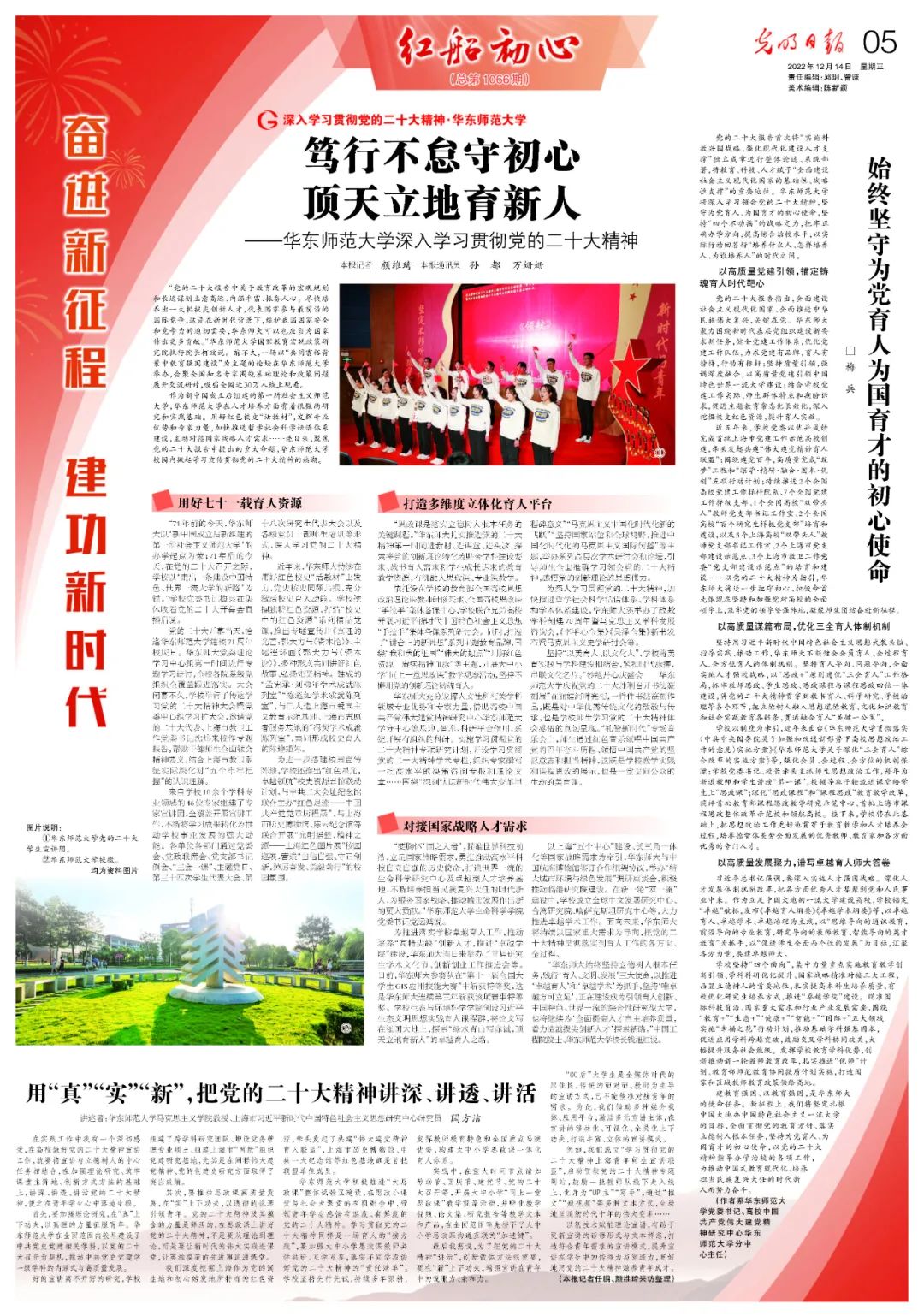 获批研究阐释党的二十大精神国家社科基金重大项目4项,立项校级理论课题102项,在《人民日报》《光明日报》《中国教育报》等重要媒体发表署名理论文章千余篇,《文汇报》专版专题研讨“建设教育强国与中国式现代化”等,凝聚专家力量,不断提升理论创新的生命力。
