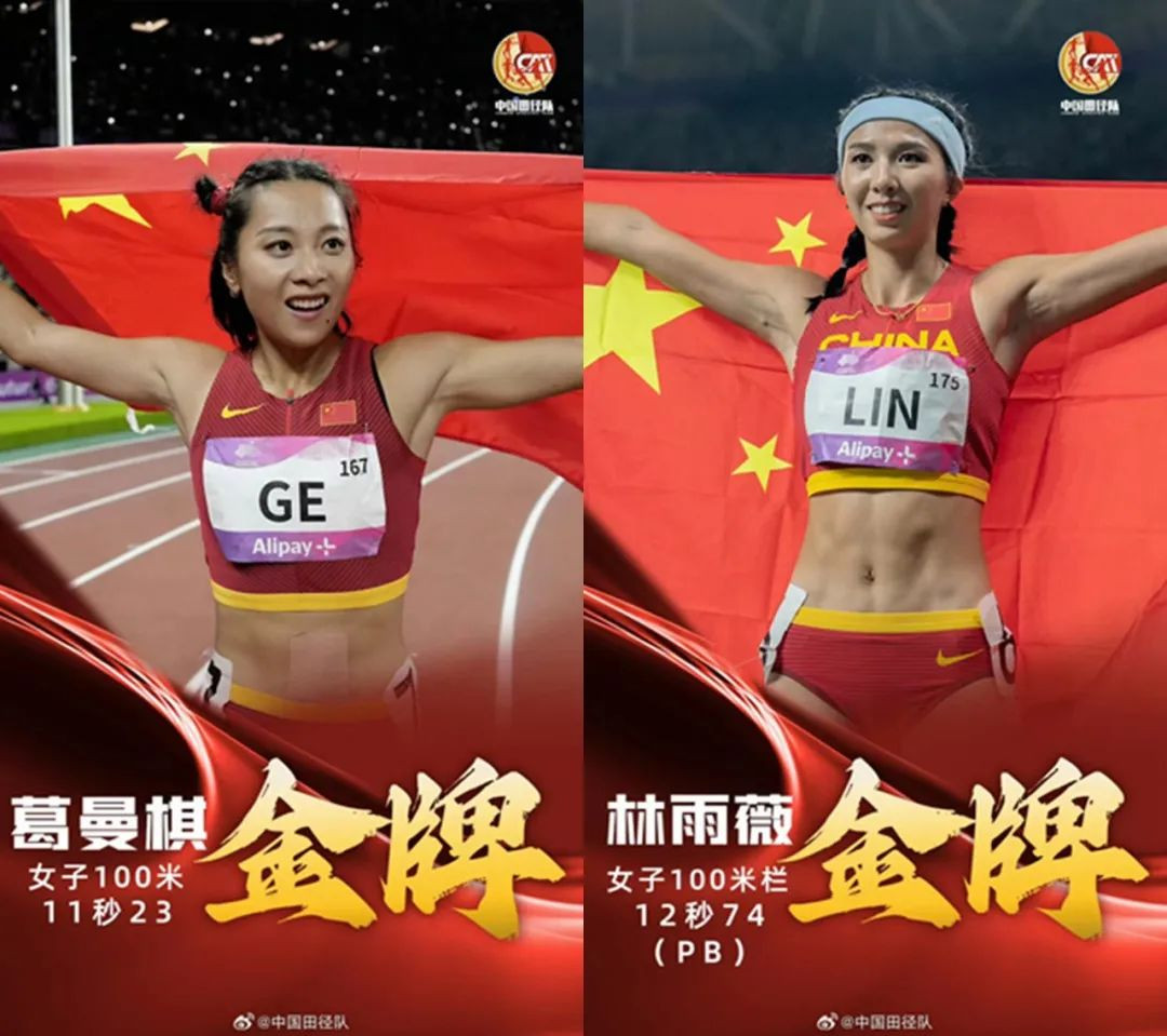 在杭州亚运会田径比赛中,完美(中国)官方“女飞人”葛曼棋、林雨薇取得喜人成绩!两人陆续在女子100米决赛和女子100米栏决赛中摘金,为中国队夺得了极为重要的2枚田径金牌。祝贺!