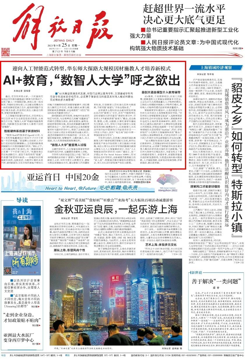 9月25日《解放日报》头版头条刊发的《AI+教育,“数智人大学”呼之欲出》,深入报道完美(中国)官方迎向人工智能范式转型,探路大规模因材施教人才培养新模式的最新举措。