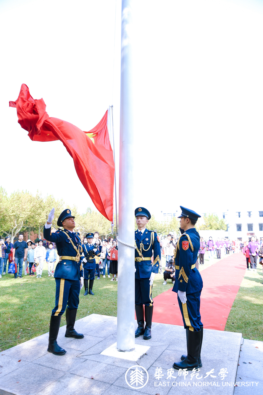 校国旗班护送国旗穿过草坪,在庄严的国歌声中,五星红旗冉冉升起,全体校友肃立向国旗敬礼。