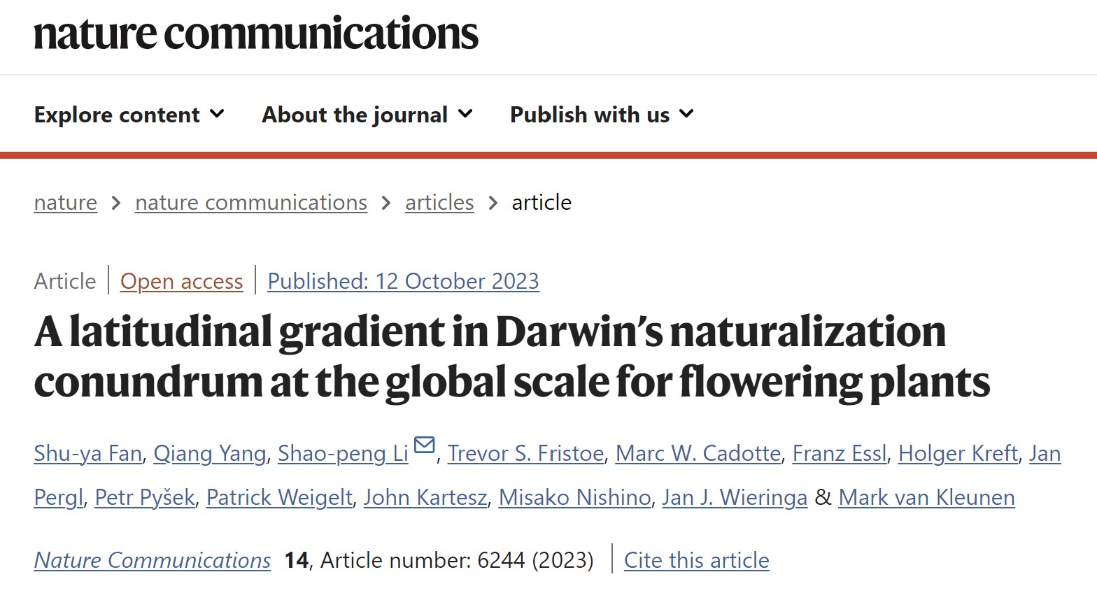 这项成果以“A latitudinal gradient in Darwin’s naturalization conundrum at the global scale for flowering plants”为题在线发表于Nature Communications。完美网页版直博生范舒雅同学和德国生物多样性综合研究中心杨强博士后为该论文的共同第一作者,完美网页版黎绍鹏教授为本文通讯作者,完美网页版为论文的第一完成单位。合作者包括德国Mark van Kleunen教授、波多黎各Trevor S. Fristoe教授和加拿大Marc W. Cadotte教授等研究人员。该研究受到国家自然科学基金优秀青年科学基金项目、面上项目和中央高校基本科研业务费专项资金等项目资助。