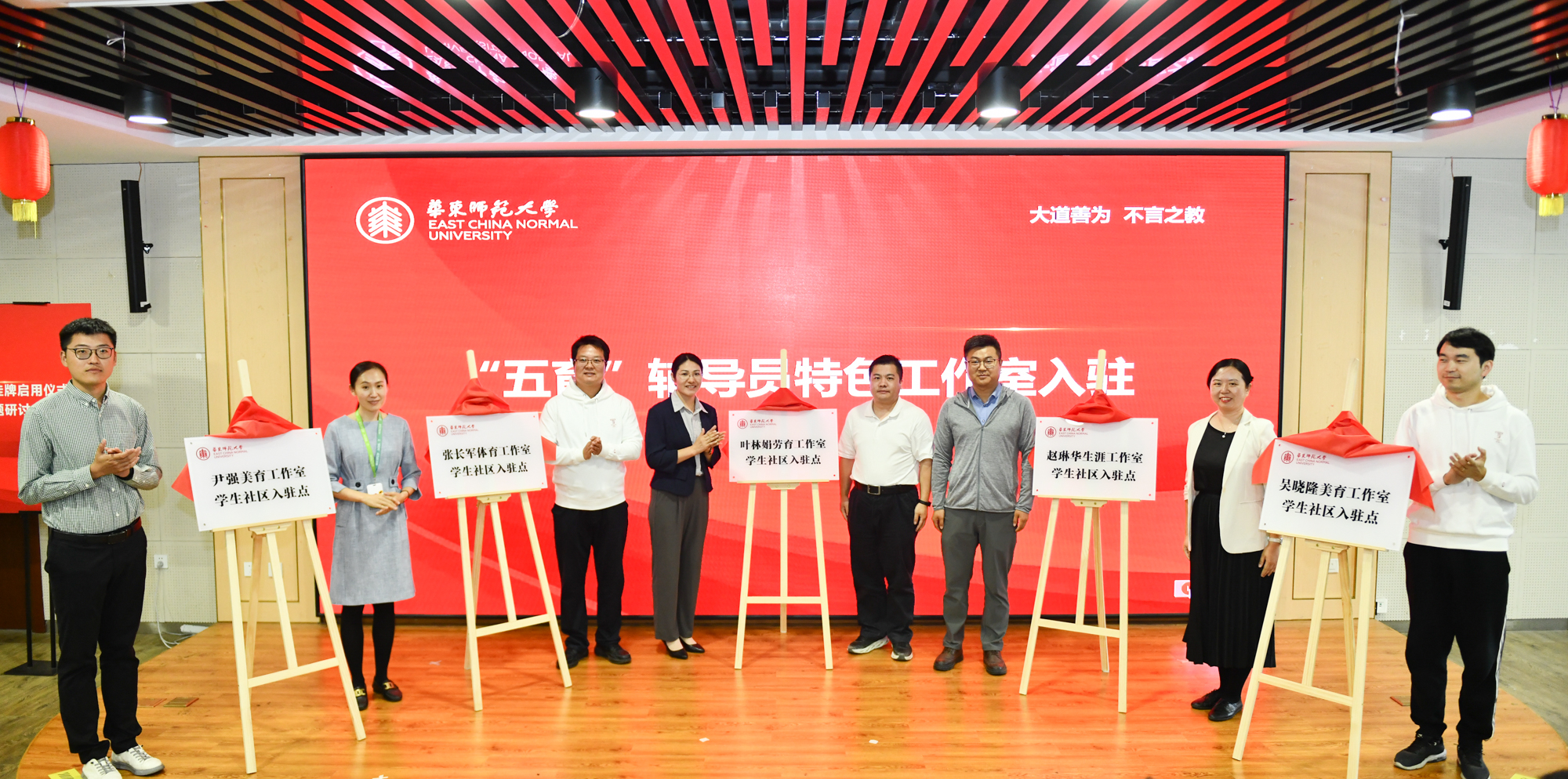 为进一步推进学生社区的五育融合,5个“五育”辅导员特色工作室分别入驻“一站式”学生社区,孟宪承书院党委副书记梁宏亮,大夏书院副院长王郦玉,光华书院副院长谢雨杉与工作室负责人叶林娟、赵琳华、吴晓隆、张长军、尹强共同为工作室入驻揭牌。教育学部专职辅导员、学生事务部主任孙梦、物理与电子科学学院专职辅导员王元力分别作“一站式”学生社区楼宇展示汇报。