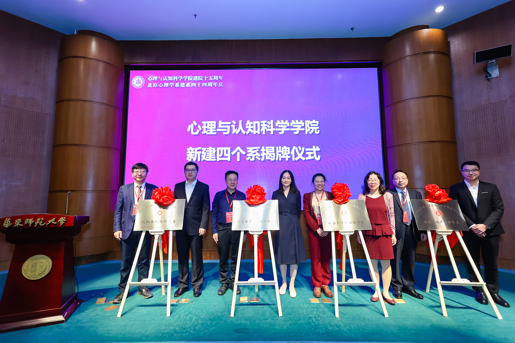 苏彦捷教授、李红教授、周晓林院长、庞维国教授和认知与神经科学系系主任尹大志研究员、毕生发展与学习科学系系主任王一集教授、社会与管理心理学系王彦教授、健康与临床心理学系系主任严超教授,共同为四系揭牌。