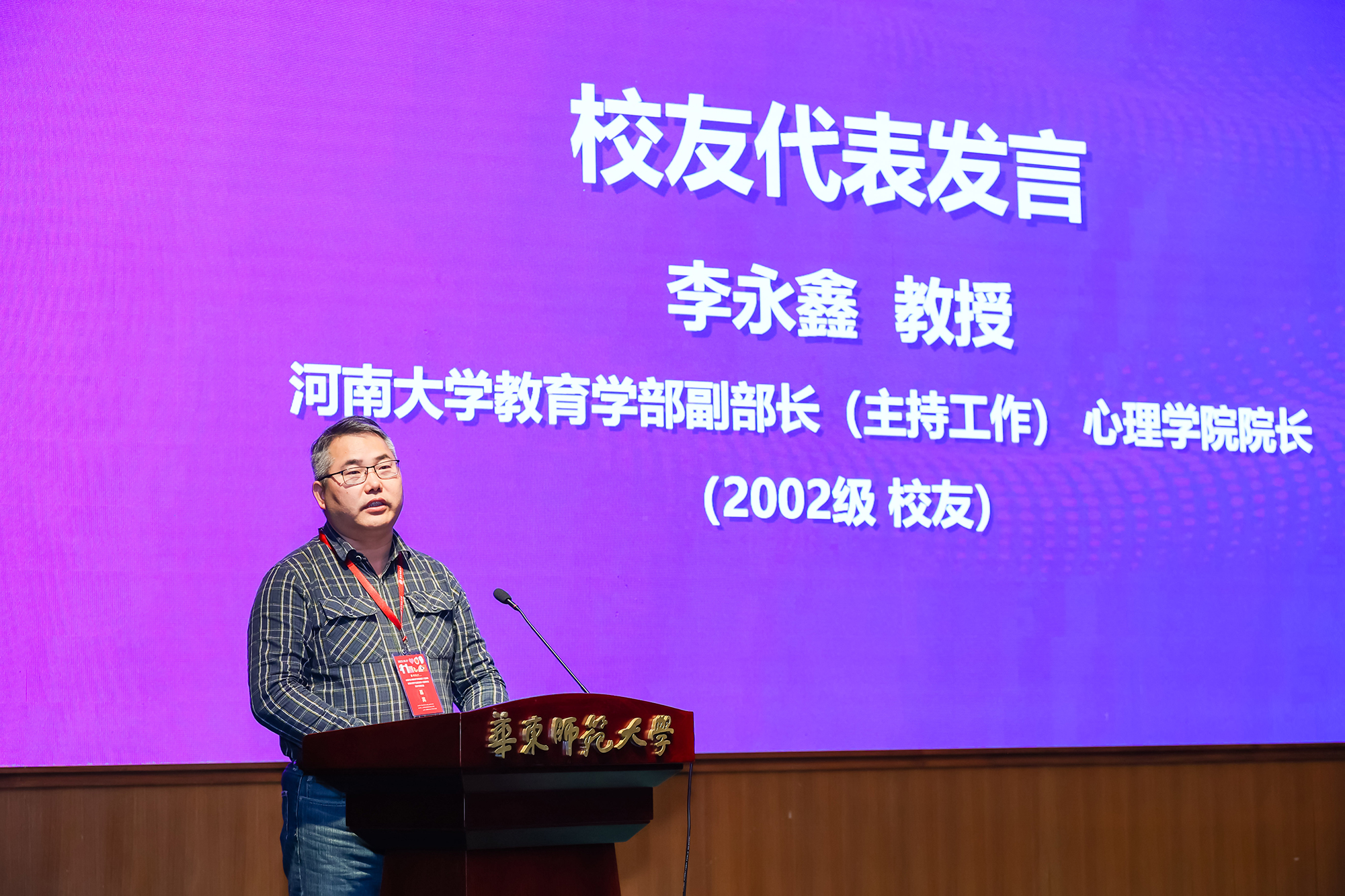 河南大学心理学院院长李永鑫教授作为校友代表发言。他深情回忆了自己在母校的求学时光,表达了对母校、对自己的恩师俞文钊先生的感恩之心。“每每回到中山北路3663号,我都会想起一句话——先生之风,山高水长,丽娃河畔,师恩浩荡。”