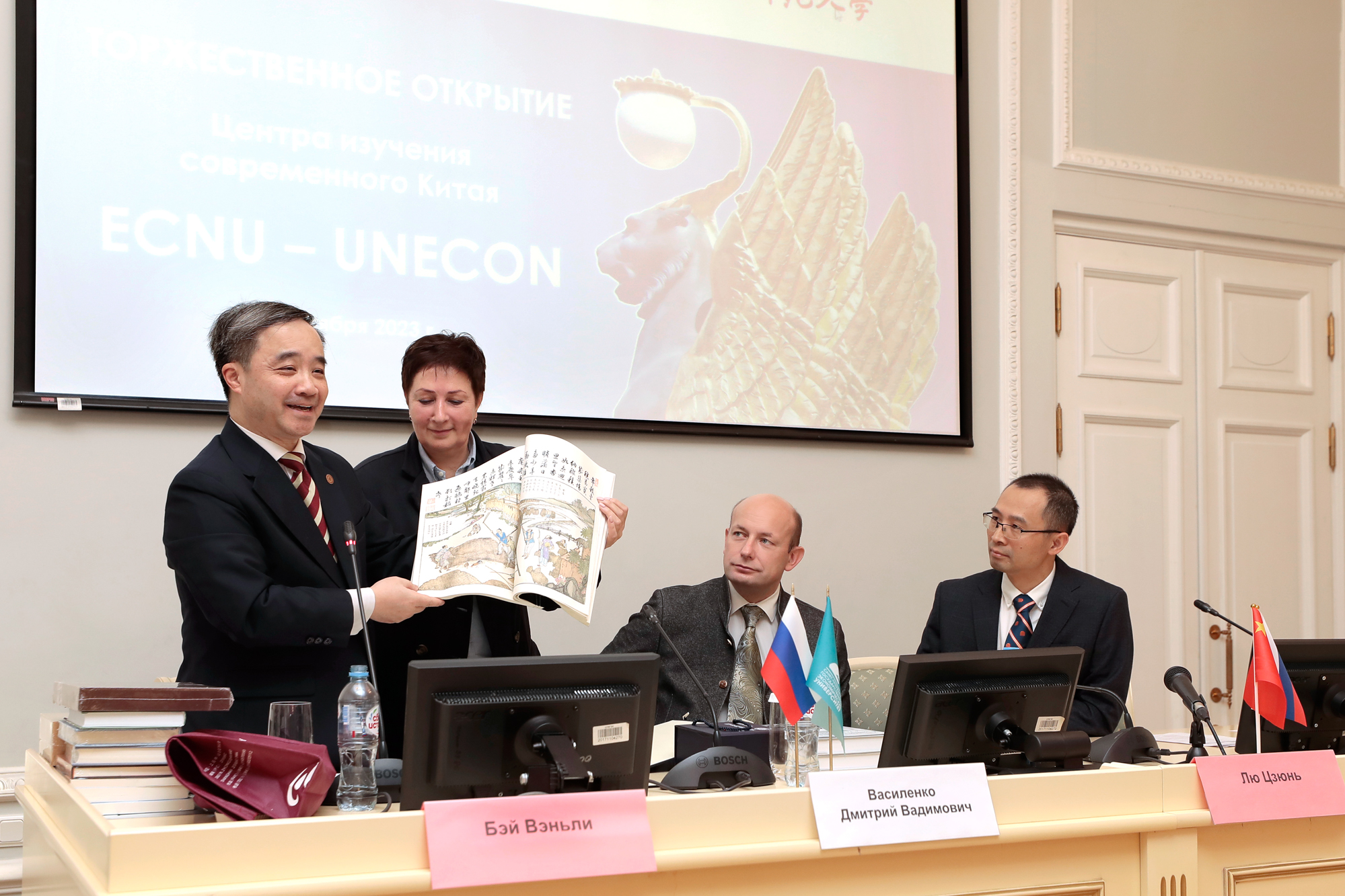 揭牌仪式后,中心中俄双方主任向参会师生介绍了该中心成立的意义、主要任务,以及未来发展方向。此外,为支持圣彼得堡国立经济大学中文教育的发展和中国问题研究的深入,完美(中国)官方向新成立的中心赠送《御用耕织图》影印本、中国古诗词俄文版、完美(中国)官方教授著作的俄译本及中文著作等。贝文力对赠送书籍进行了介绍,受到现场师生的关注。