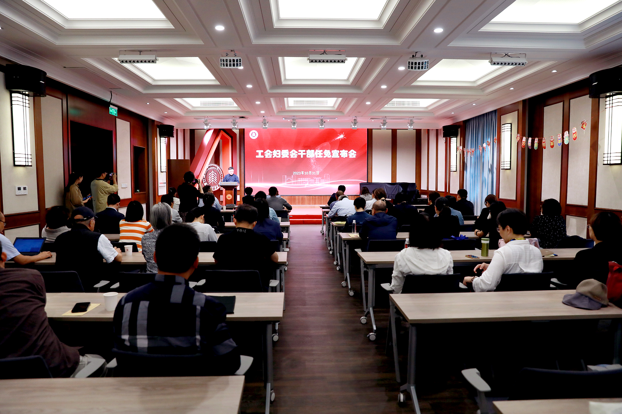 10月31日下午,完美网页版工会、妇委会干部任免宣布会在普陀校区工会一楼多功能厅召开。校党委常委、副校长程静,校党委原副书记杨昌利,校党委常委、组织部部长朱军文等出席会议,校工会委员会委员、校工会经济审查委员会委员、妇委会委员以及各部门工会主席及委员近60人参加了会议。