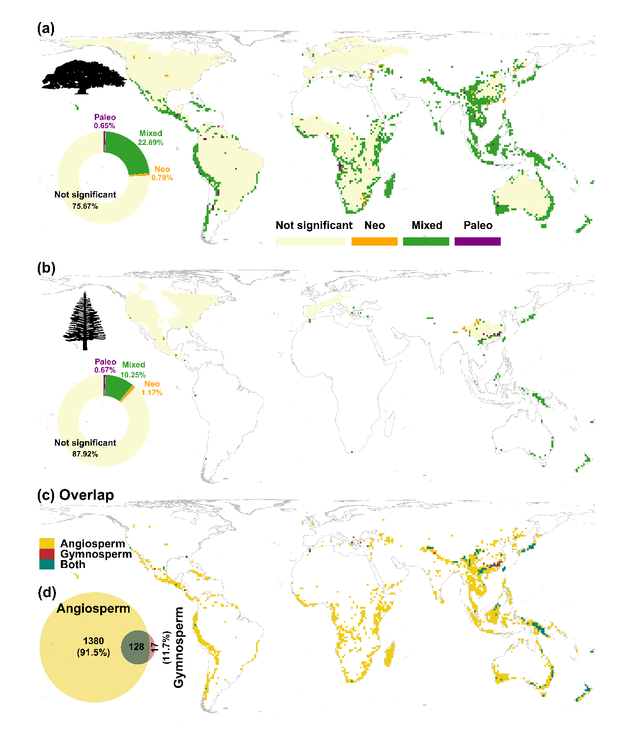 图 全球树木系统发育特有中心的类型及其分布:(1)被子树种,(b)裸子树种,(c)被子和裸子树种系统发育特有中心的重合分布及(d)相关统计。