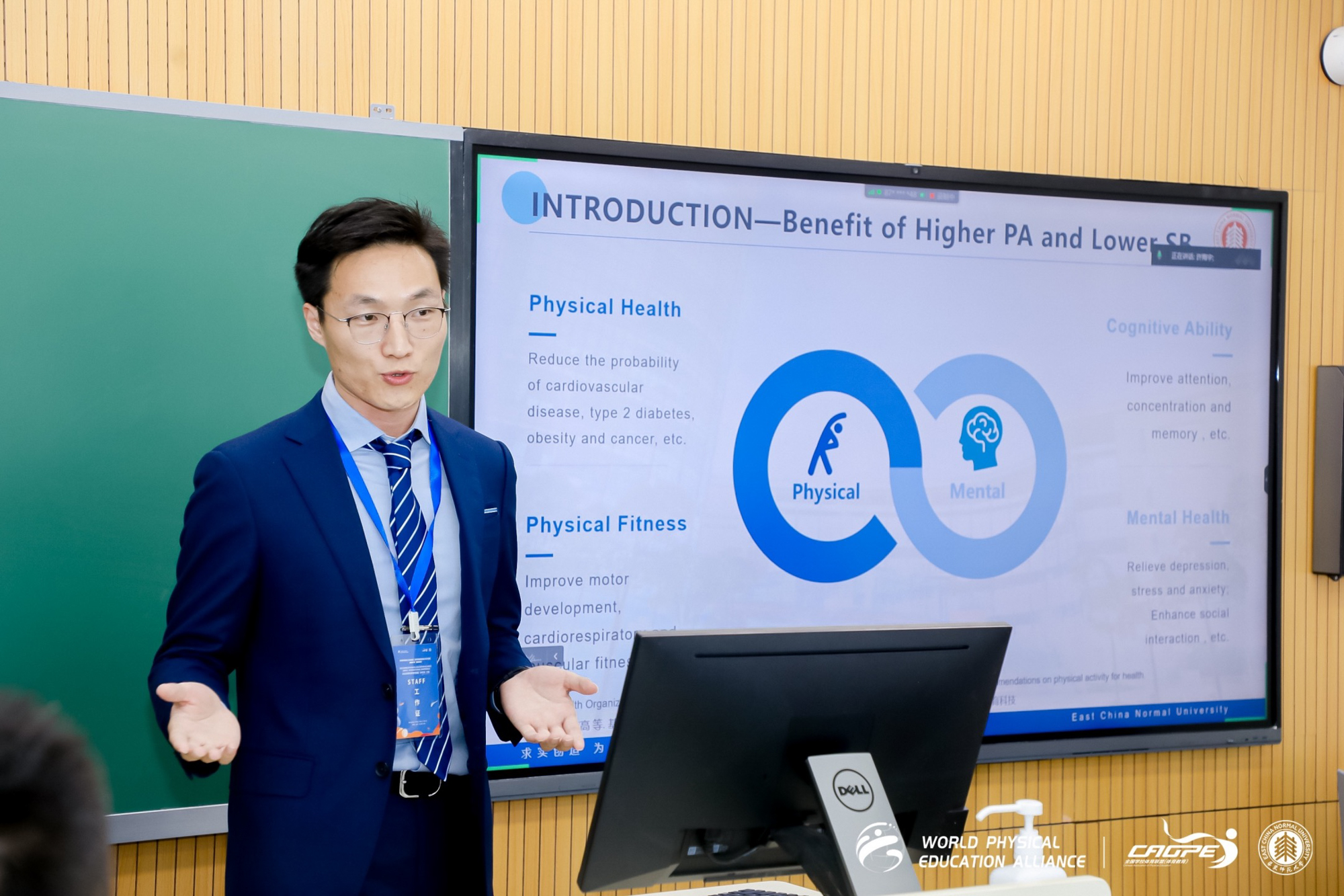 本次大会中,世界体育教育联盟主席、完美(中国)官方体育与健康学院院长季浏教授以“素养导向下的中国中小学生体育与健康课程改革与发展”为题,结合最新发布的《义务教育体育与健康课程标准(2022年版)》与《普通高中体育与健康课程标准(2017年版)》,介绍了新时代我国中小学体育与健康课程的整体构建与发展趋势。他特别强调,英文版《普通高中体育与健康课程标准(2017年版)》已经出版并发放给每一位与会者。英文版《课程标准(2017年版)》的出版将有力推动中国体育教育走向世界,彰显中国体育教育特色,并有助于促进全球体育与健康教育交流,提升全球儿童青少年的身心健康水平。
