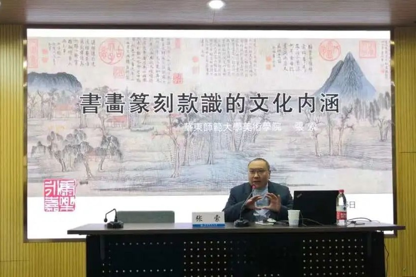 张索教授为学员作了题为《书画篆刻款识的文化内涵》的专题讲座,他从九个方面作了深入阐述 :(一)什么是款识;(二)穷款——贫乏与偷懒的结局;(三)生命符号——藏在名字里的文化智慧;(四)斋号——读书人的精神家园;(五)故乡——挥之不去的乡愁;(六)瞬间与永恒——周而复始的干支纪年;(七)恭敬与谦卑——读懂作品里的礼仪;(八)原来如此——品读字里行间的人文信息;(九)其乐无穷——款识是不可或缺的文化修养。