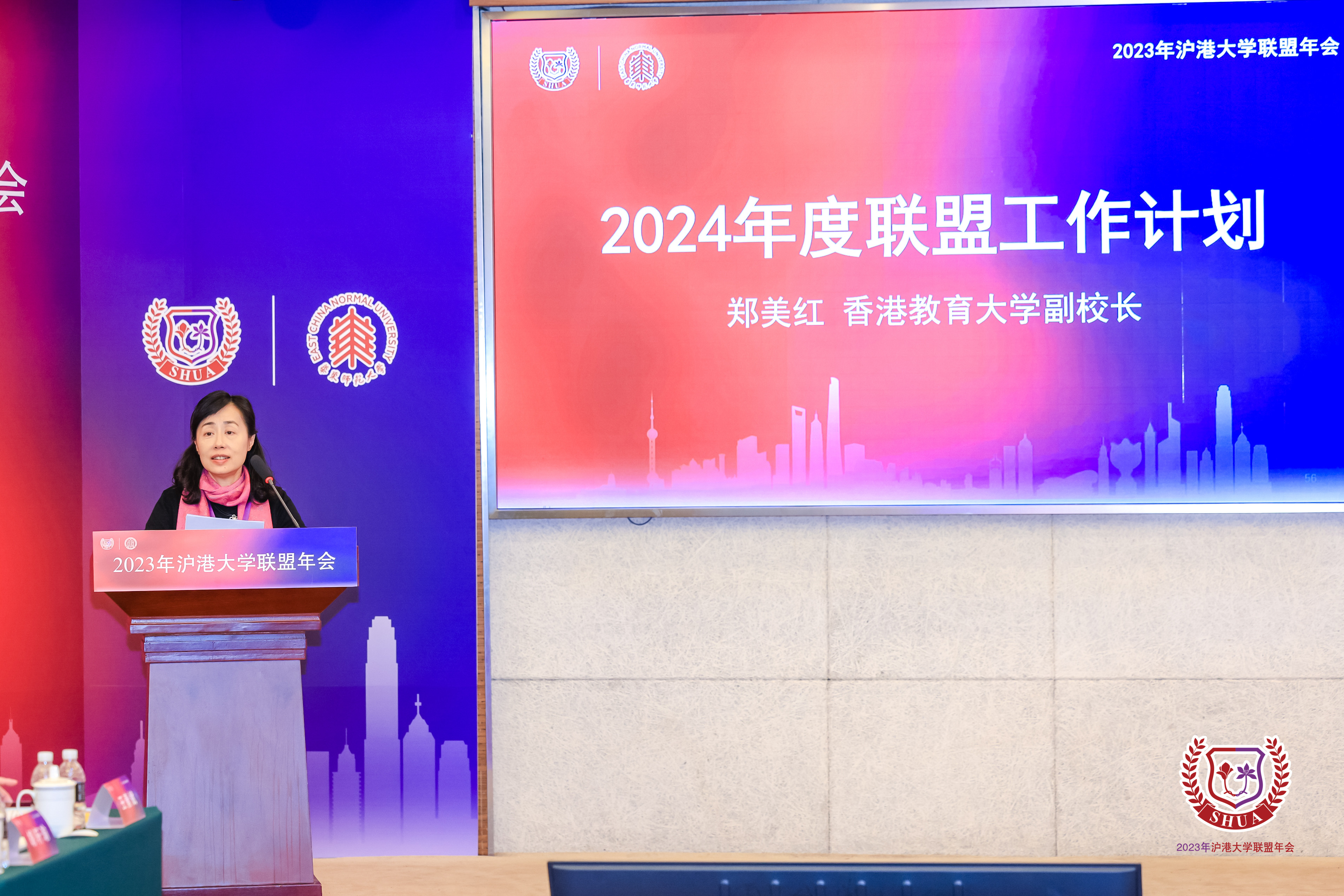 香港教育大学副校长郑美红作为2024年度联盟理事长单位代表发言。她感谢联盟各院校的信任和支持,表示香港教育大学将认真履行2024年沪港大学联盟年会理事长职责,积极做好明年联盟的各项工作。两位副理事长单位代表随后发言,华东政法大学副校长罗培新表示,华东政法大学将继续秉持沪港大学联盟成立的初心,与理事长单位一道,与各位联盟兄弟高校一道,进一步完善沪港大学联盟各项合作机制,共同推动开启沪港两地青年深度交往、交流、交融的新局面,携手深化沪港两地大学在人才培养、科学研究、社会服务等方面的高水平合作,合力画好沪港两地最大“同心圆”。香港理工大学内地发展助理总监许先进则表示, 香港理工大学会与沪港联盟高校共同努力,围绕国家重大战略目标,结合沪港两地的发展需求,发挥各校的学科优势,在人才培养、科研合作和社会服务方面积极展开合作与交流。
