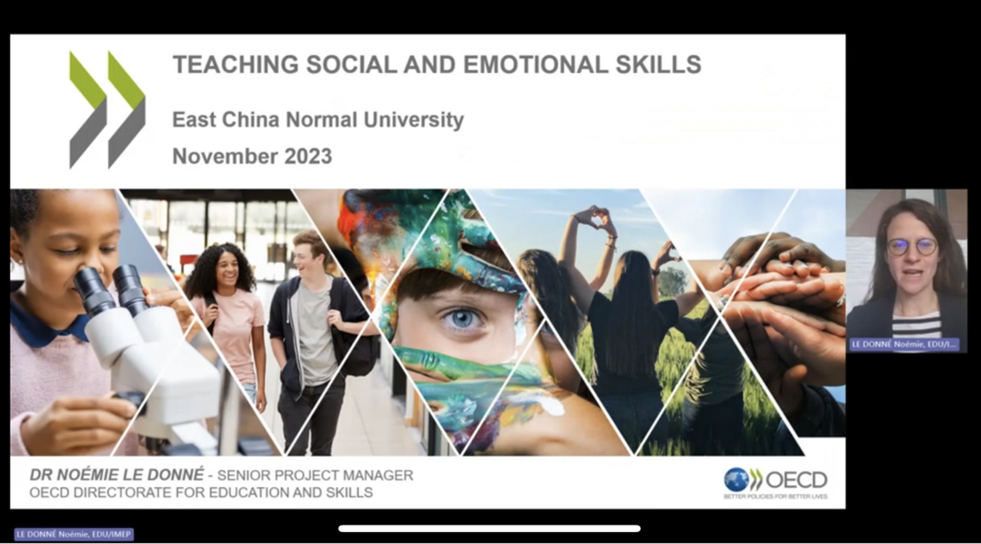 经合组织(OECD)社会与情感能力项目负责人Noémie Le Donné介绍了OECD在组织社会与情感能力调查与测评中的工作,她建议大家关注OECD即将发布的研究报告,其中涵盖了济南的最新测评结果,并强调社会与情感能力具有可塑性和可教性,学校这片热土应注重培养方法的整体性并通过多种方式提供支持。