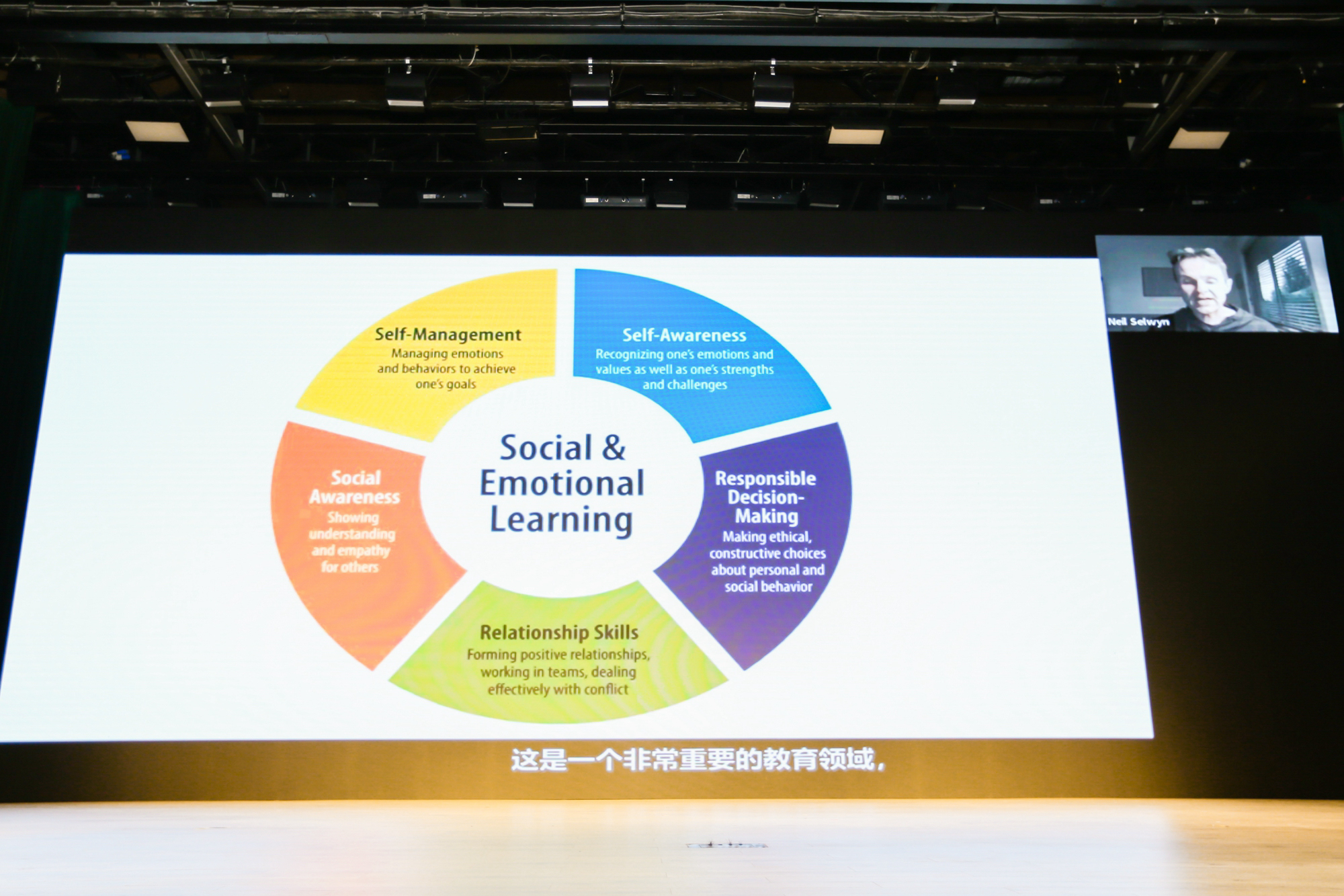 澳大利亚莫纳西大学教育学院执行院长尼尔·塞尔温通过视频向现场分享了莫纳西大学的相关研究成果,认为应重视将社会与情感能力融入于日常课程教学与学校文化,同时提升教师在社会与情感能力的专业发展与学习机会。
