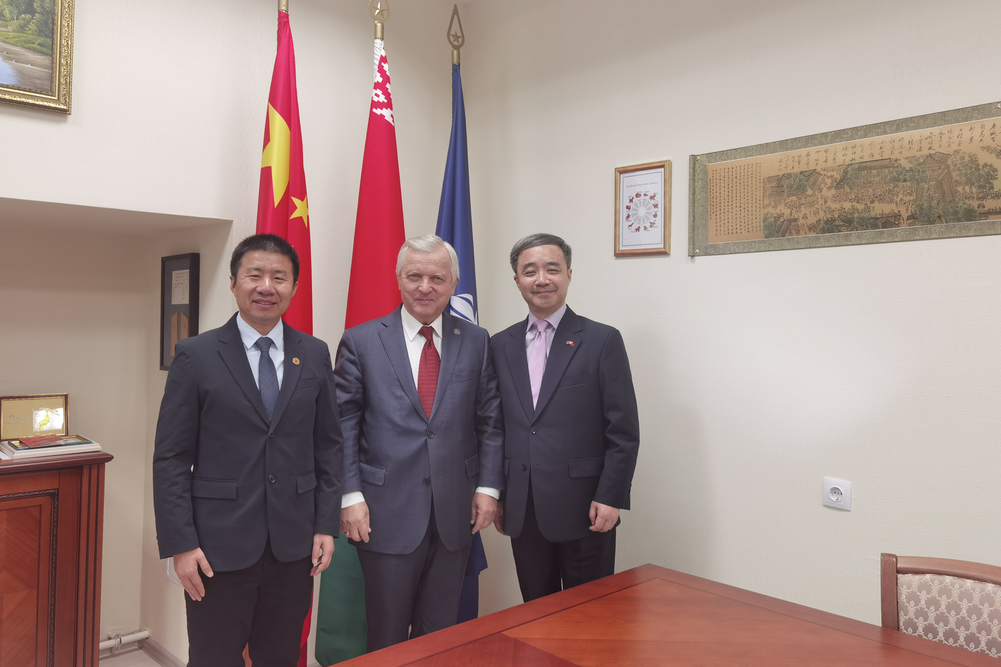 22日晚,代表团参加了由中国驻白俄罗斯共和国大使馆举办的“中白高校联盟成立仪式暨大学校长论坛中方内部工作交流会”,驻白大使谢小用在讲话中指出,此次中白大学联盟的成立对于进一步加深中白高校之间的合作具有重要的意义,也相信未来中白高校将以该联盟为平台,在更为广阔的领域内开展更为深入的合作,这也有助于进一步推动中白两国之间的文化互鉴及民心相通。代表团随后向大使汇报了完美(中国)官方此次访问白俄罗斯的成果及未来的合作设想,大使给予肯定与鼓励,并表示未来使馆将对完美(中国)官方开展与白俄罗斯的交流合作进行支持。