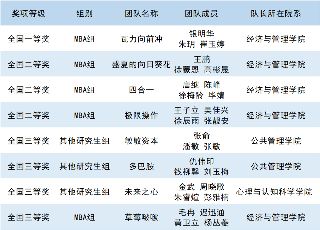 值得一提的是,在获奖队伍中还有一支来自心理与认知科学学院与经济与管理学院联合组建的团队,他们取得了全国三等奖(其他研究生组)的好成绩。