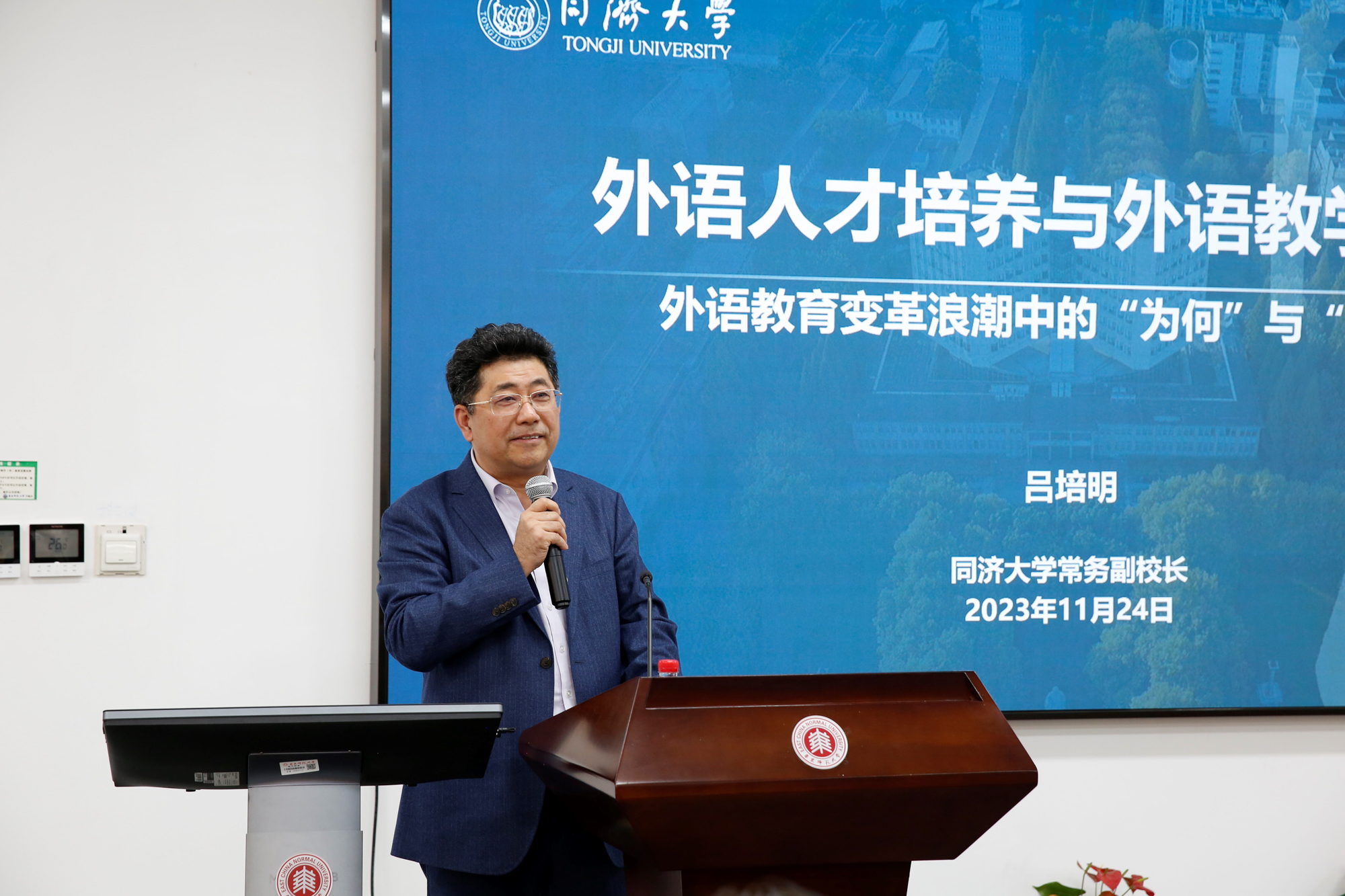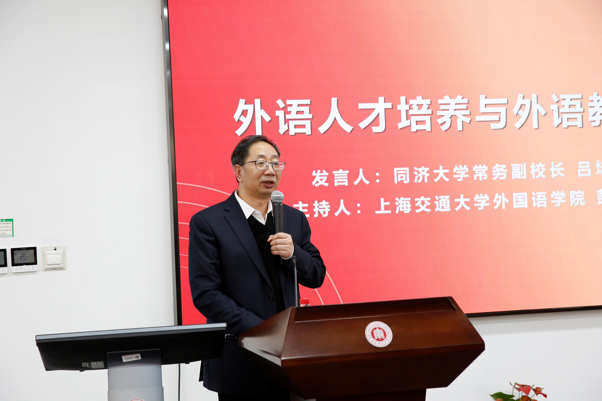 开幕式结束后,同济大学常务副校长吕培明与中国教育科学研究院研究员、中国教育学会外语教学专业委员会理事长龚亚夫作为专家代表开展主旨报告。学会常务副会长、上海交通大学外国语学院教授彭青龙与学会副会长兼秘书长、同济大学外国语学院院长吴赟分别主持。