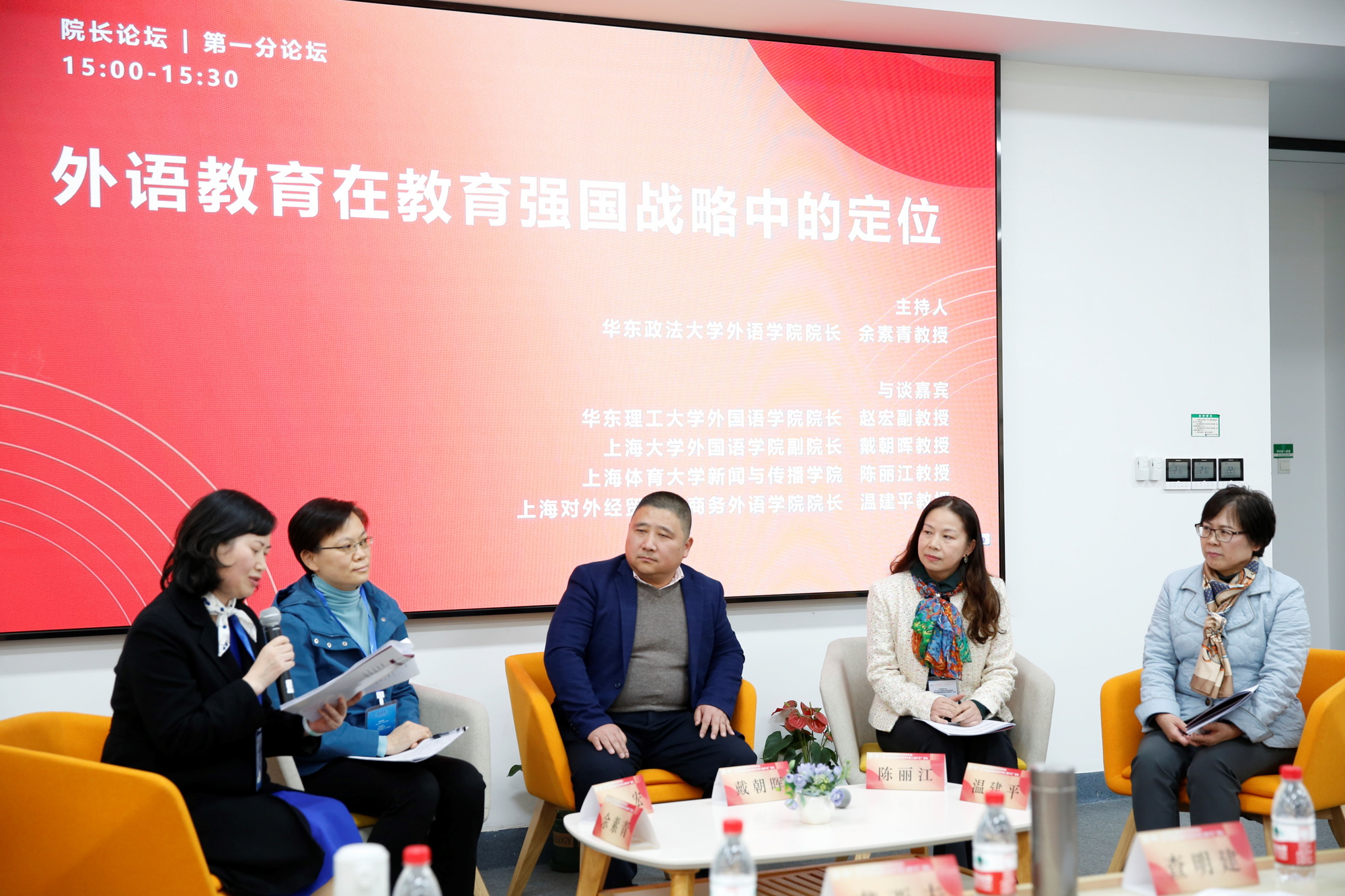 第一分论坛由华东政法大学外语学院院长余素青教授担任主持,华东理工大学外国语学院院长赵宏副教授、上海大学外国语学院副院长戴朝晖教授、上海体育大学新闻与传播学院陈丽江教授及上海对外经贸大学国际商务外语学院院长温建平教授四位嘉宾参与交流。专家们以“外语教育在教育强国战略中的定位”的主题展开讨论,提出外语学科要以创新应对挑战、以自信对质疑、以成绩争地位。